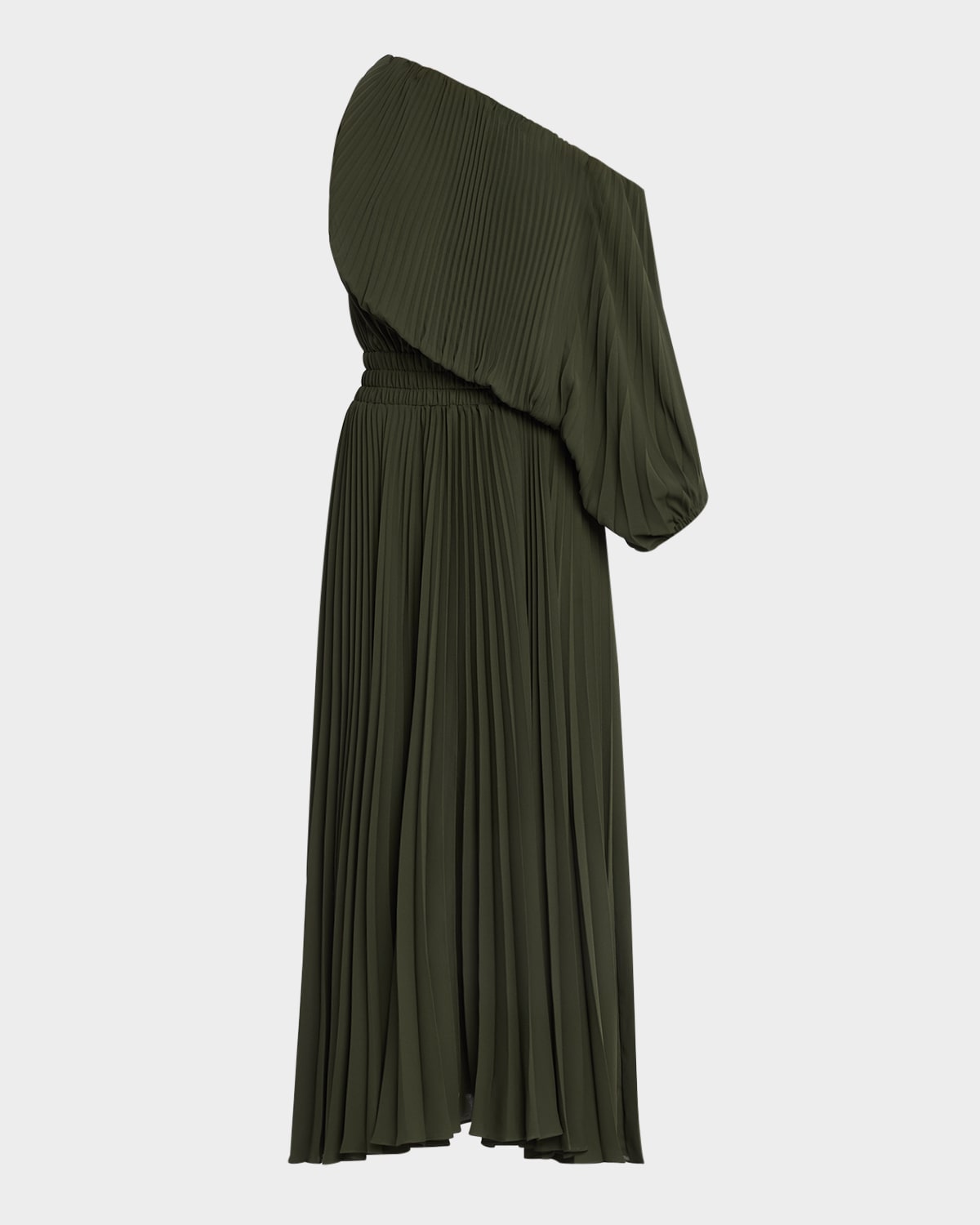 A.L.C. "Mara" asymmetric fitandflare dress finished with textural pleating Oneshoulder neckline Long blouson sleeve Elasticated waistband Aline skirt Full length Slipover style Polyester Unlined Dry clean Imported