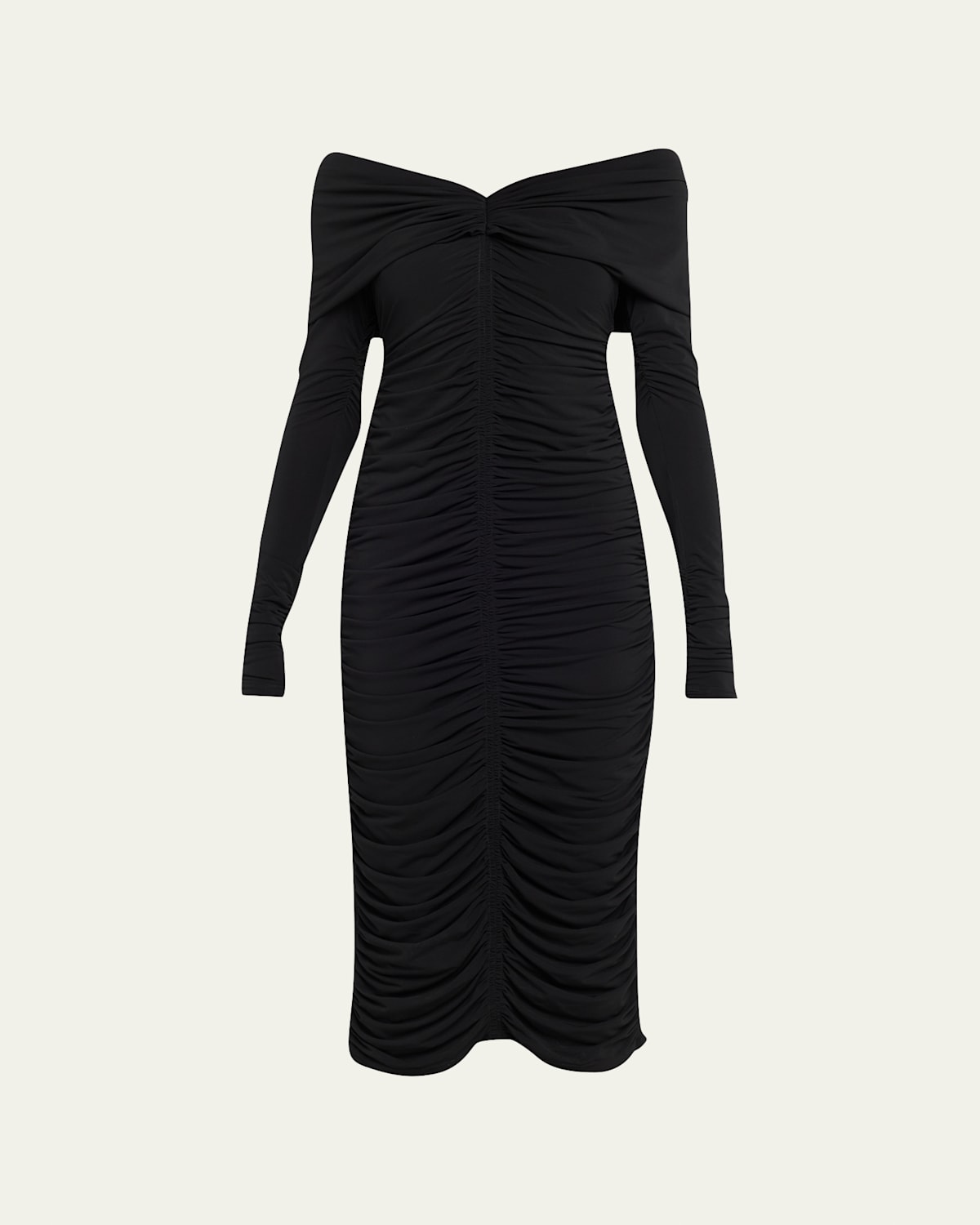 A.L.C. "Marie" stretchjersey midi dress featuring ruching throughout Offtheshoulder neckline Long sleeves Bodycon fit Hem falls below the knee Slipover style Viscose/polyester/elastane Dry clean Imported
