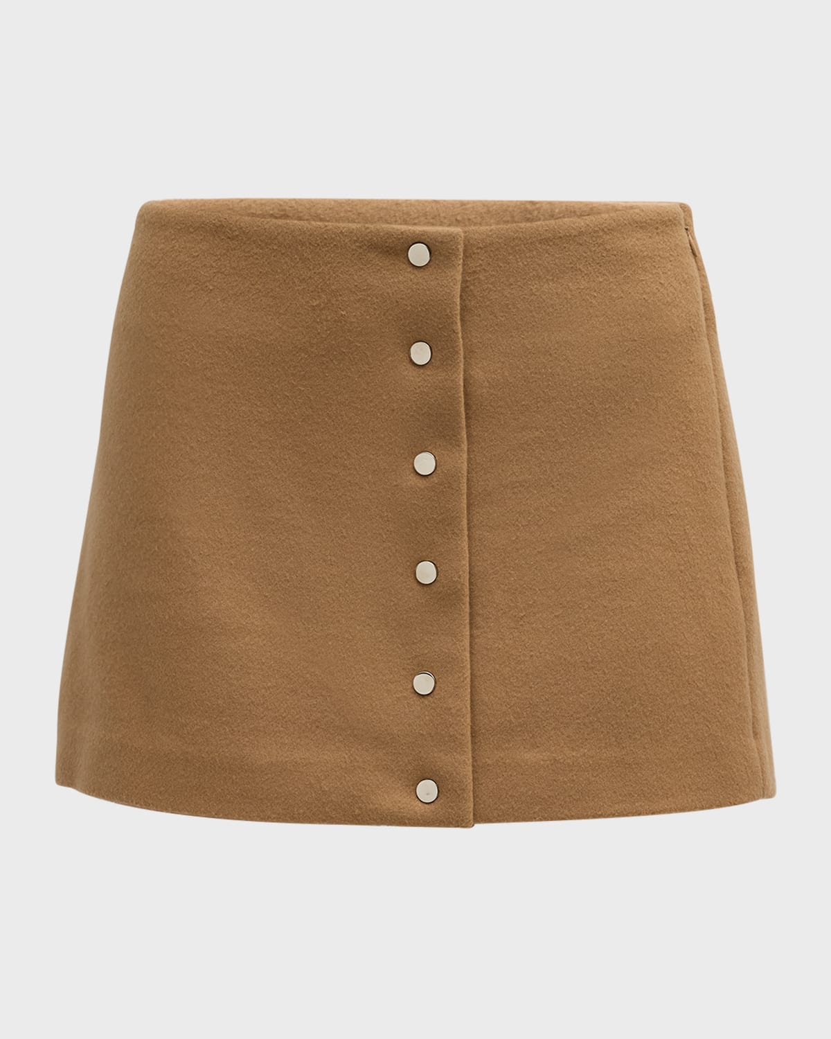 A.L.C. "May" brushed woolblend skirt featuring a snap front detail Mid waist sits high on hip Mini length Skirt falls straight from hip to hem Invisible side zip Wool/cashmere Lining: Cotton/polyester Dry clean Imported