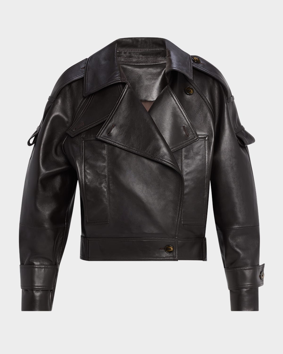 A.L.C. "Miles" utilitystyle jacket crafted from soft calfskin leather Oversized collar; asymmetric button front Shoulder epaulettes Long sleeves with exaggerated belted cuffs Sideentry welt pockets Oversized fit Hip length Leather Unlined Dry clean Imported