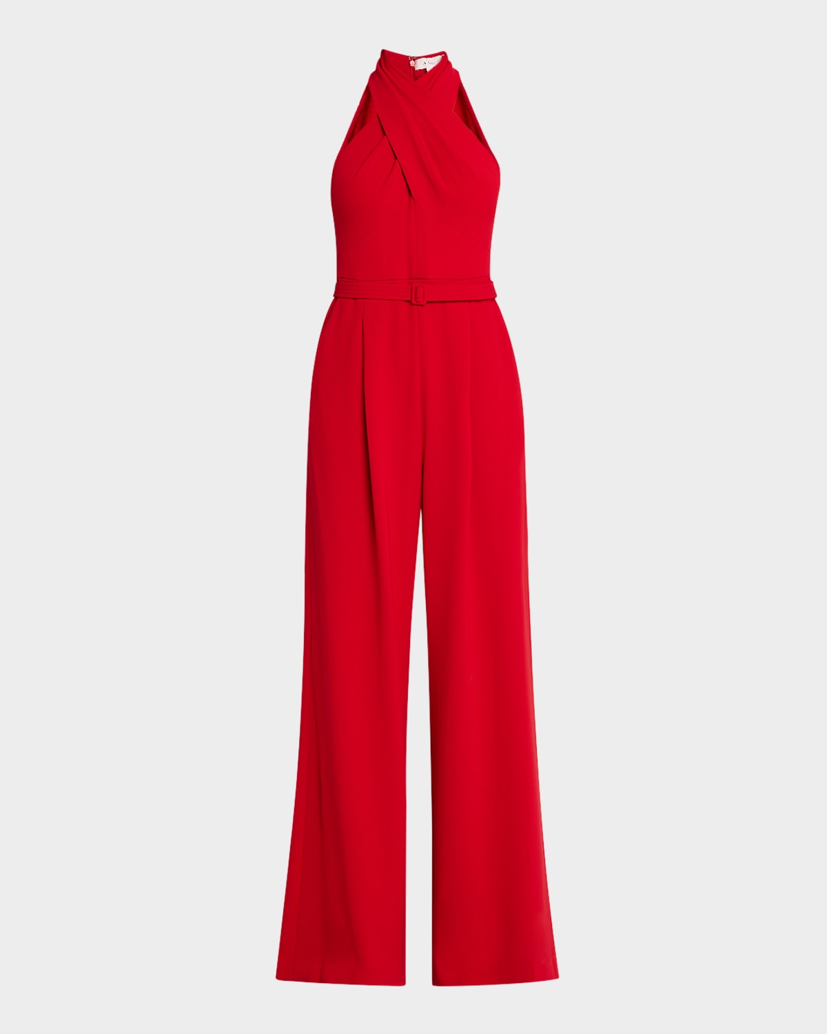 A.L.C. "Murphy II" solid jumpsuit featuring a crisscross front and belted waist Halter neckline Sleeveless Belted waist Fourpocket style Wide legs Full length Invisible back zip; stepin style Triacetate/polyester Unlined Dry clean Imported