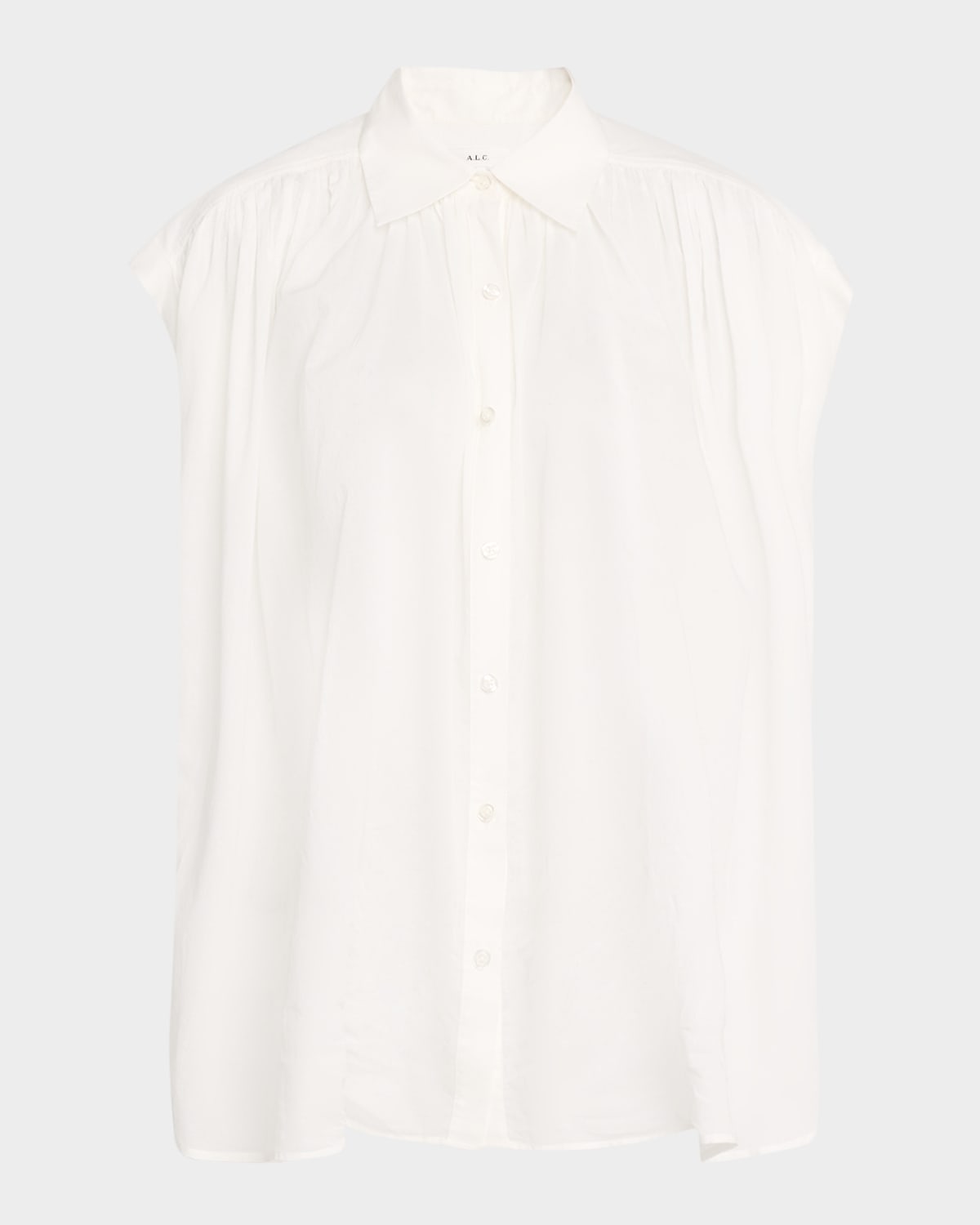 A.L.C. "Nessa" cotton top with gathering at the shoulders Point collar Cap sleeves Loose fit Hem falls to the hip Buttonfront Cotton Unlined Dry clean Imported