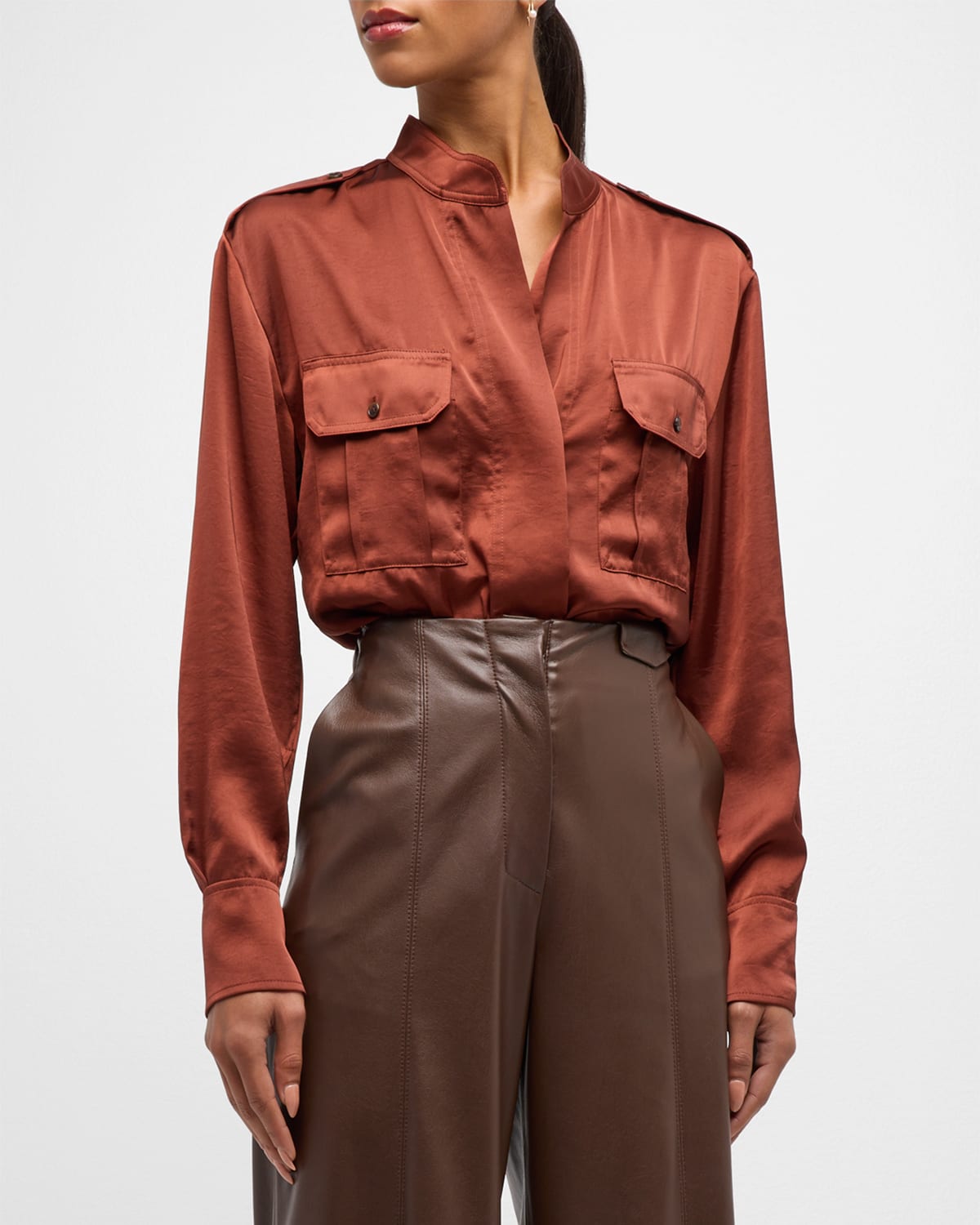 A.L.C. "Oakley" buttonfront top Stand collar Epaulets Long sleeves; button cuffs; approx. 23.8"L Easy fit Hem falls to the hip Hidden front closure Polyester Dry clean Imported