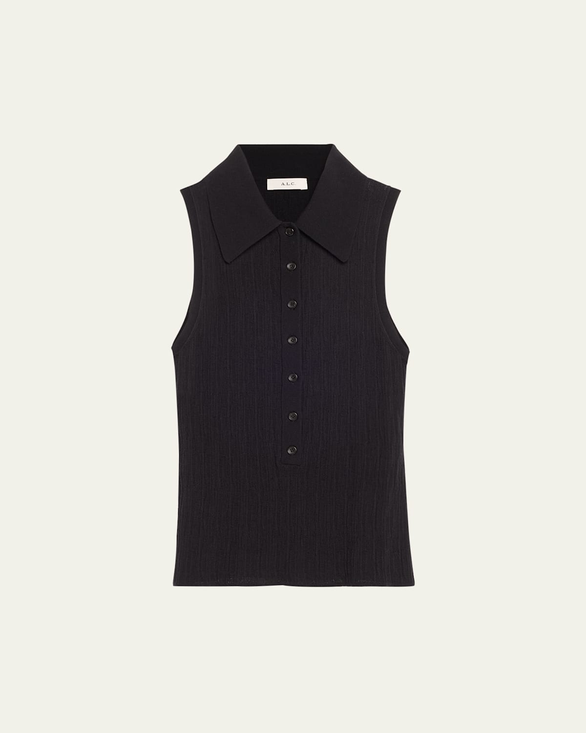 A.L.C. "Oliver" ribbedknit top featuring a buttonfront Point collar Sleeveless Fitted silhouette Hem sits at the hip Cotton Lining: Cotton/polyester Dry clean Imported