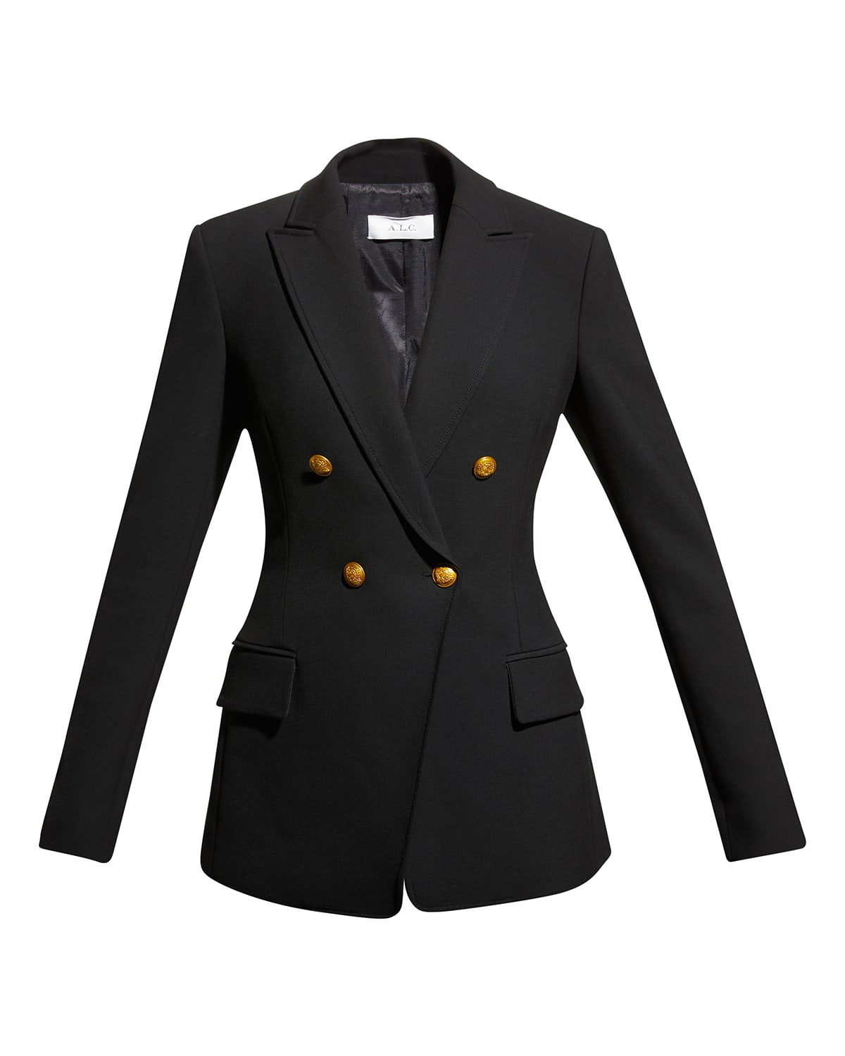 A.L.C. "Sedgwick II" stately jacket boasts a structured fit with golden shank buttons Approx. 29.3"L from shoulder to hem Peak lapels; doublebreasted front Long sleeves Hip flap pockets Cutaway front Polyester/viscose/cotton Lining: Polyester/cotton Dry clean Imported