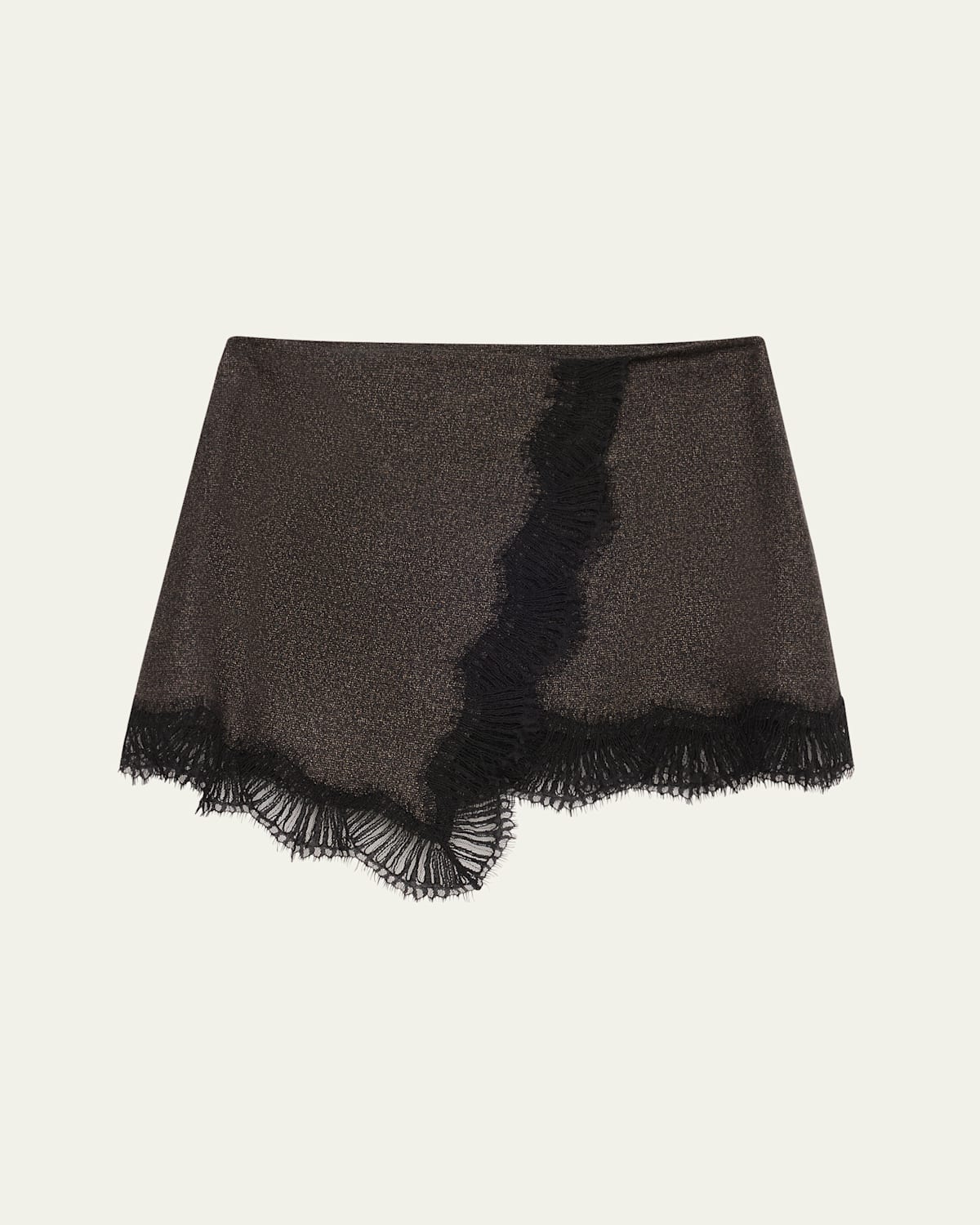 A.L.C. "Sophia" sparkly mini skirt decorated with lace trim High rise Elastic waistband Wrap silhouette Asymmetric hem Pullon style Virgin wool/viscose/elastane Lining: Cotton/polyester Dry clean Imported