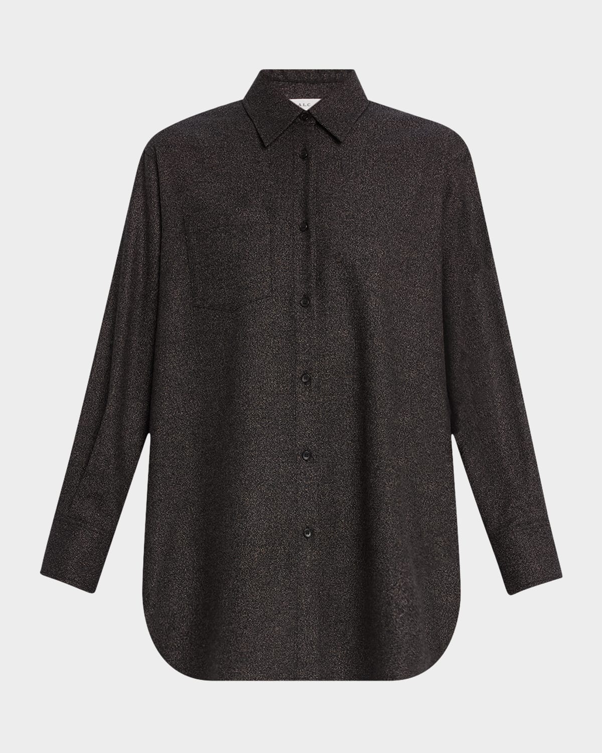 A.L.C. "Spence" woolblend tuniclength top woven with sparkle flecks Shirt collar; button front Long sleeves; button cuffs Single chest patch pocket Yoked back Relaxed fit Shirttail hem Virgin wool/viscose/elastane Unlined Dry clean Imported