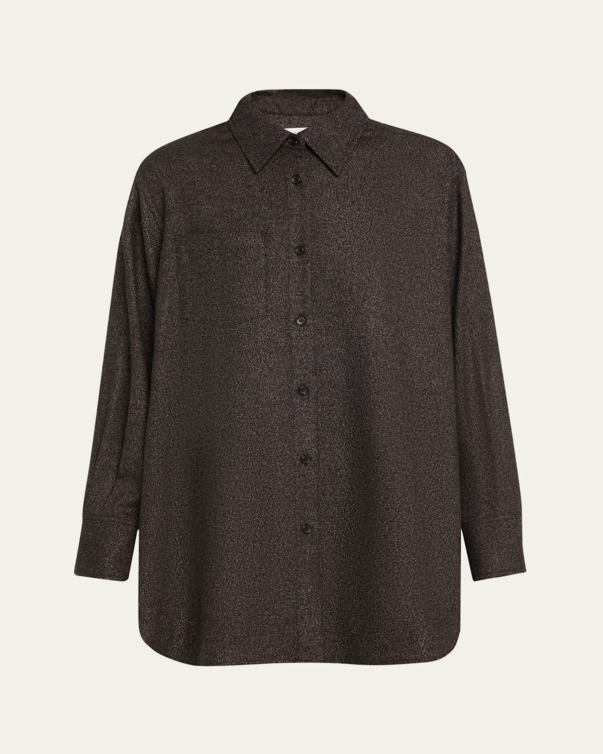 A.L.C. "Spence" woolblend tuniclength top woven with sparkle flecks Shirt collar; button front Long sleeves; button cuffs Single chest patch pocket Yoked back Relaxed fit Shirttail hem Virgin wool/viscose/elastane Unlined Dry clean Imported
