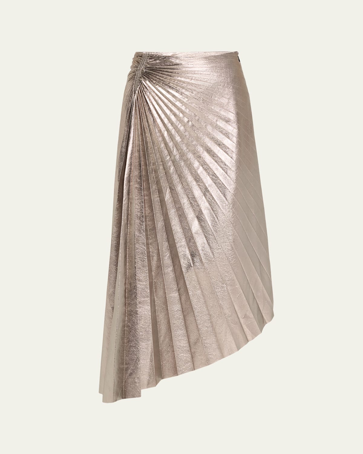 A.L.C. "Tracy" metallic vegan leather midi skirt finished with pleating High rise Slim fit Highlow hem Invisible side zip Polyester Dry clean Imported