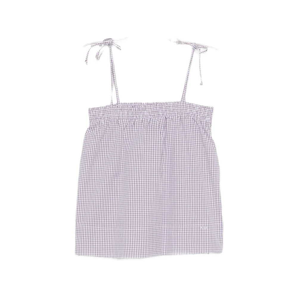 white/dark brown check pattern square neck tie-fastening shoulder straps sleeveless