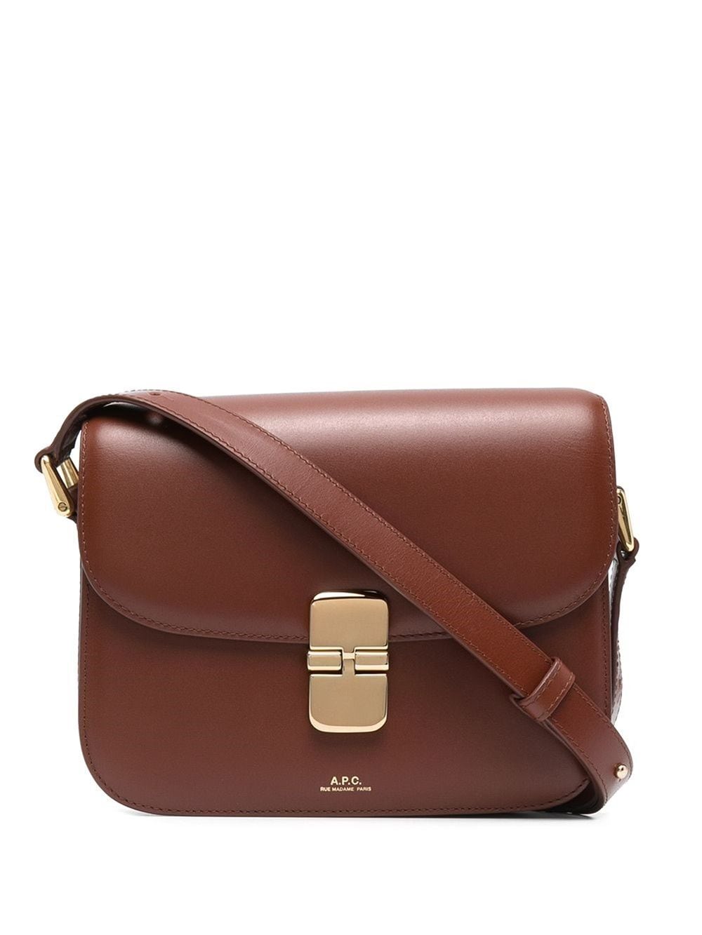 brown leather adjustable shoulder strap main compartment foldover top clasp fastening