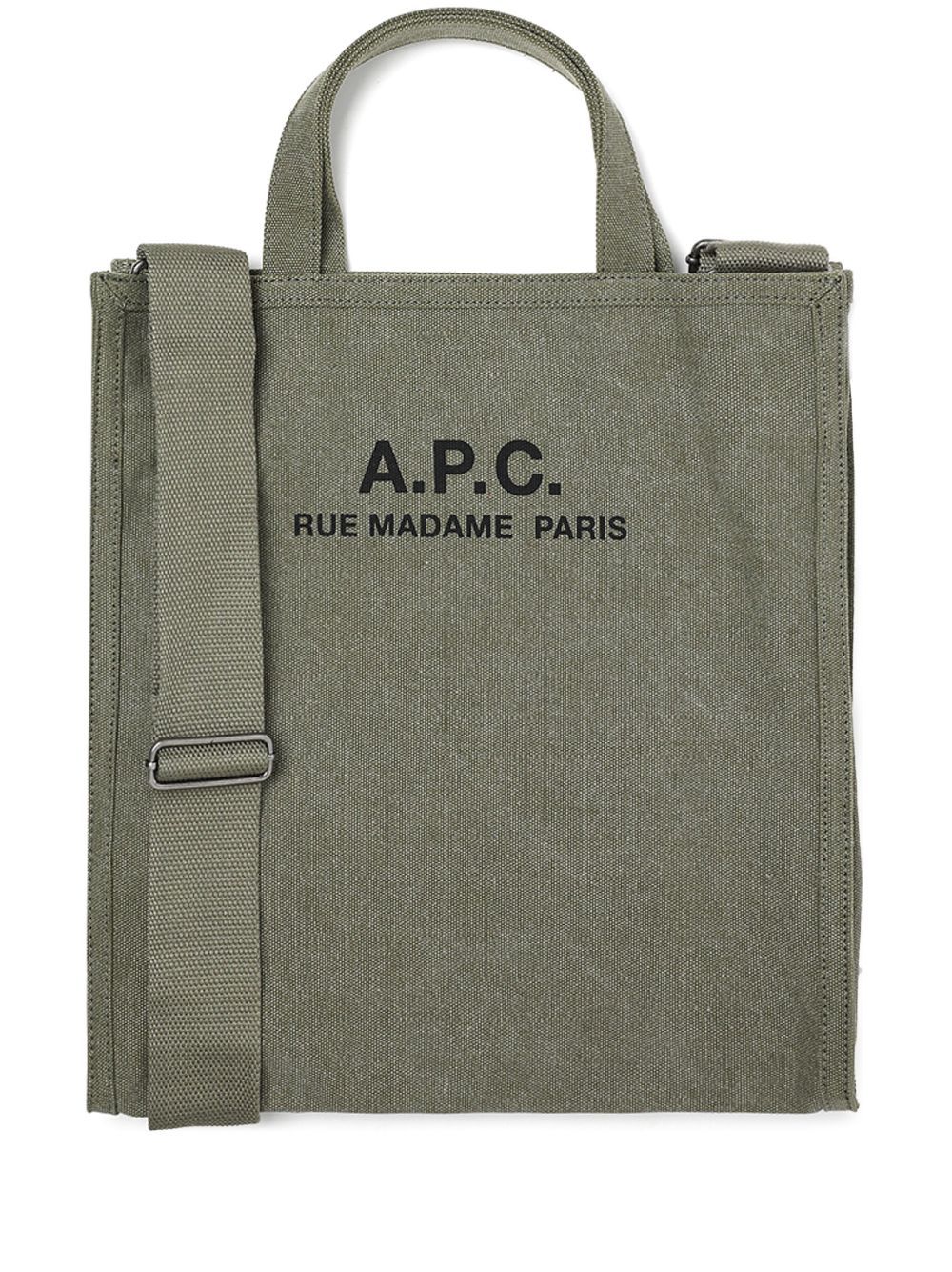 olive green cotton canvas logo print to the front two flat top handles adjustable shoulder strap main compartment