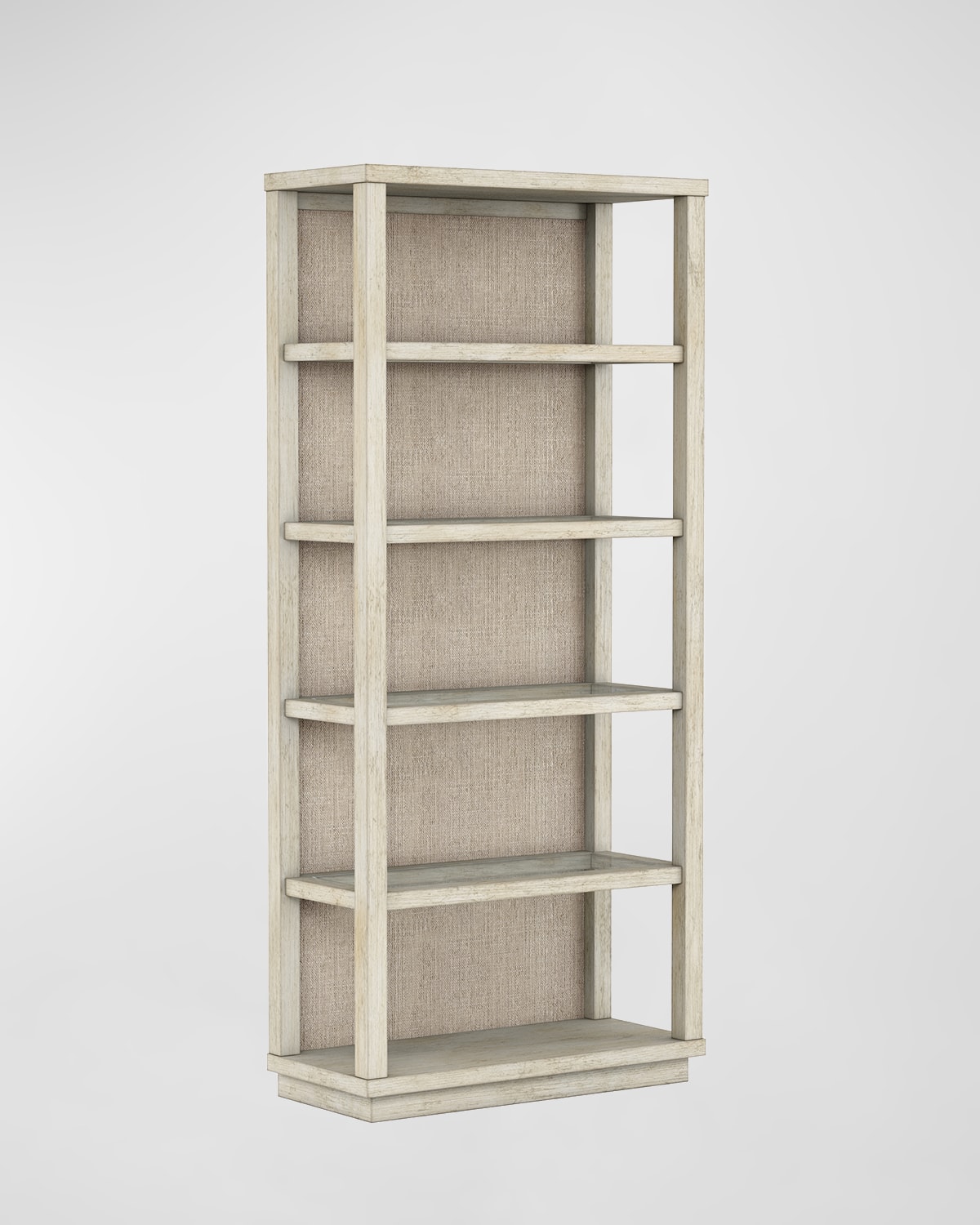 Make a statement with your storage with a soaring 80" etagere that's sure to become the centerpiece of any room. This piece presents five shelves against a back panel wrapped in woven fabric, attracting attention without overwhelming the space with its subtle white oak veneer and breezy opensided construction. Plinthstyle base features adjustable levelers Features five fixed woodframed glass shelves Handcrafted of engineered hardwood, glass, and polylinen fabric Overall, approx. 36"W x 16"D x 80"T Assembly required; includes hardware Weight, 145.0lbs Imported Boxed weight, approximately 178.5lbs
