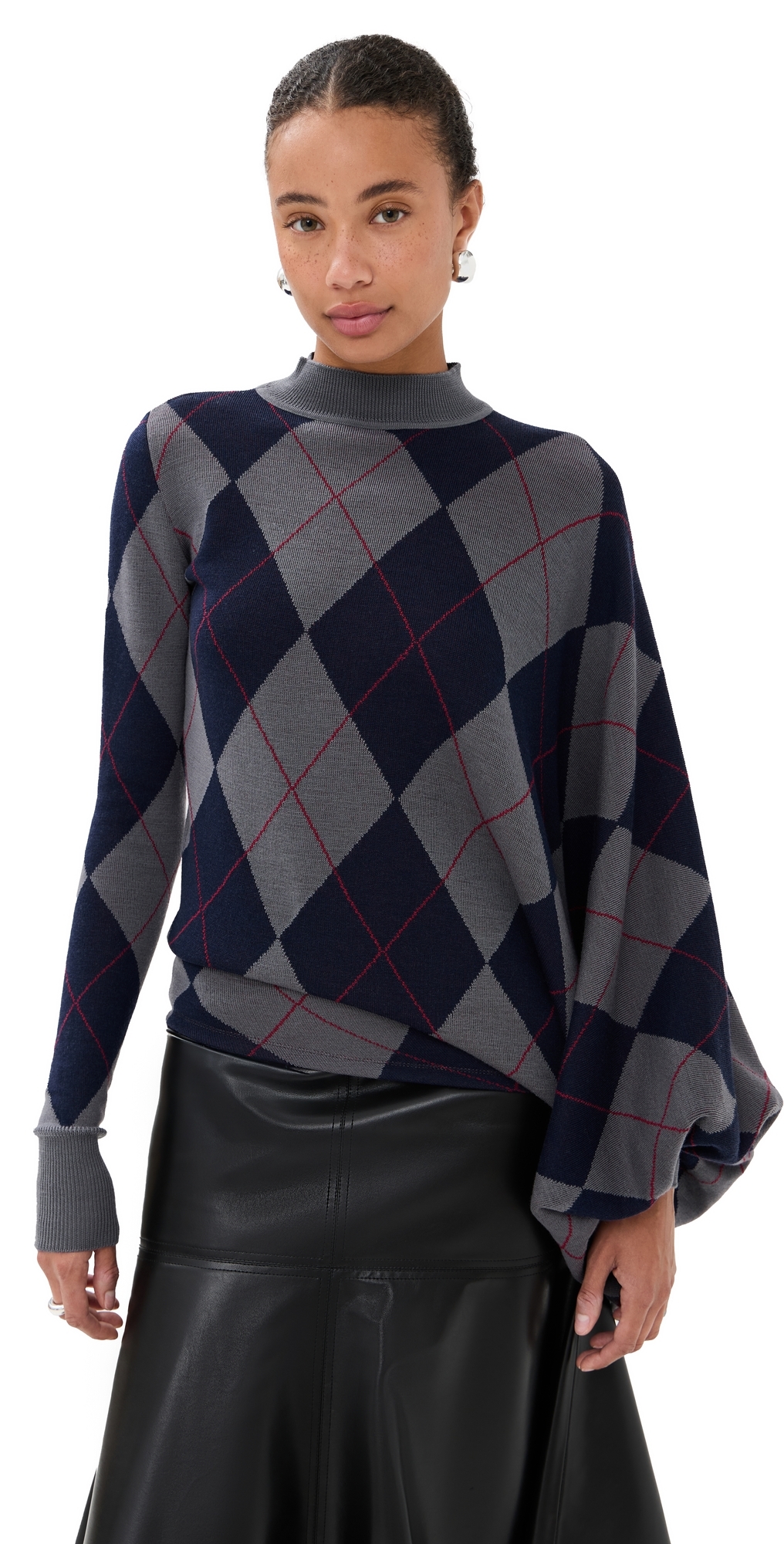 Fabric: Mid-weight stretch knit. Slouchy, asymmetrical design. Argyle pattern. Mock neck. Long sleeves. Shell: 100% wool. Hand wash or dry clean. Made in Italy. Measurements: Measurements from size XS Length: 23.5in / 60.0cm, from shoulder