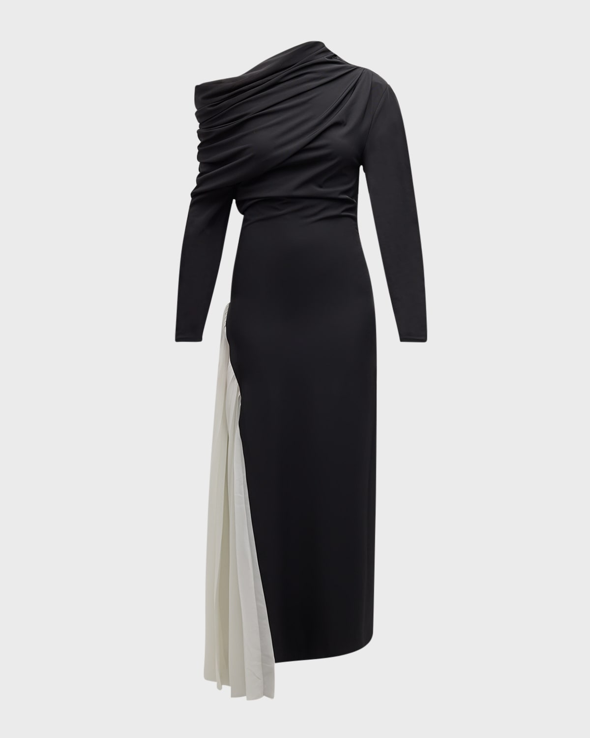 A.W.A.K.E. MODE maxi dress featuring a contrasting pleated side panel in crepe jersey Draped asymmetric neckline Long sleeves Aline silhouette Full length Slipover style Elastane/polyester Dry clean Made in Portugal