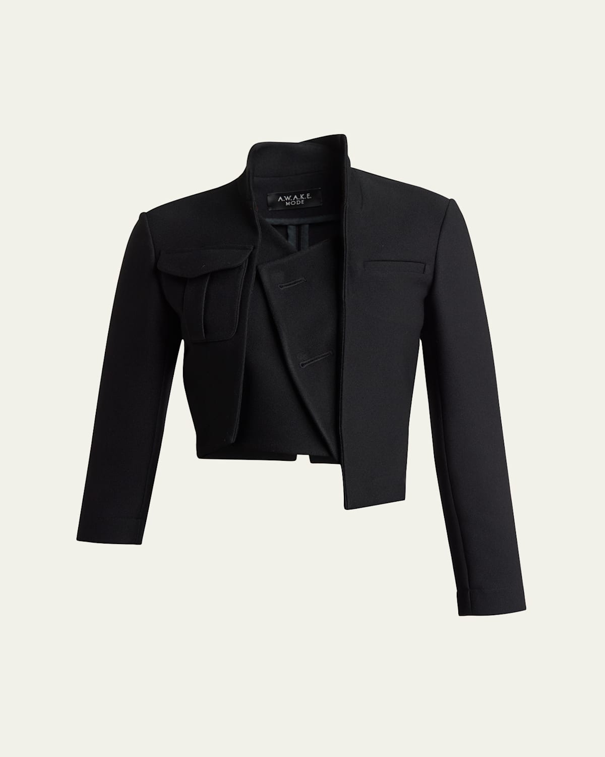 A.W.A.K.E. MODE asymmetric jacket Stand collar Threequarter sleeves Chest flap and welt pockets Tailored fit Cropped length Buttonfront Polyester Dry clean Made in Poland