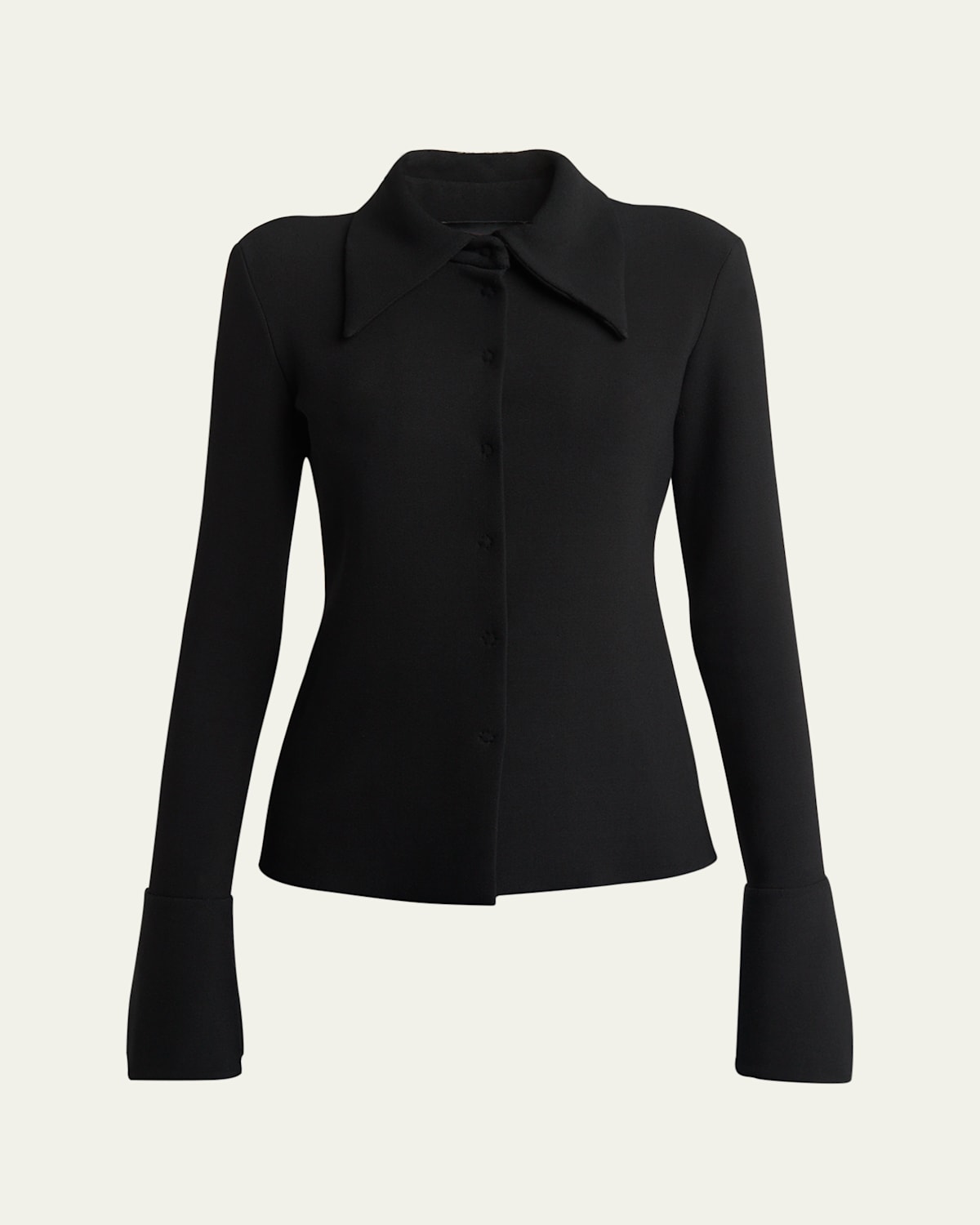 A.W.A.K.E. MODE buttonfront stretchknit shirt Point collar Long sleeves with elongated cuffs Fitted Hem sits at the hip Polyester/wool/elastane Dry clean Imported