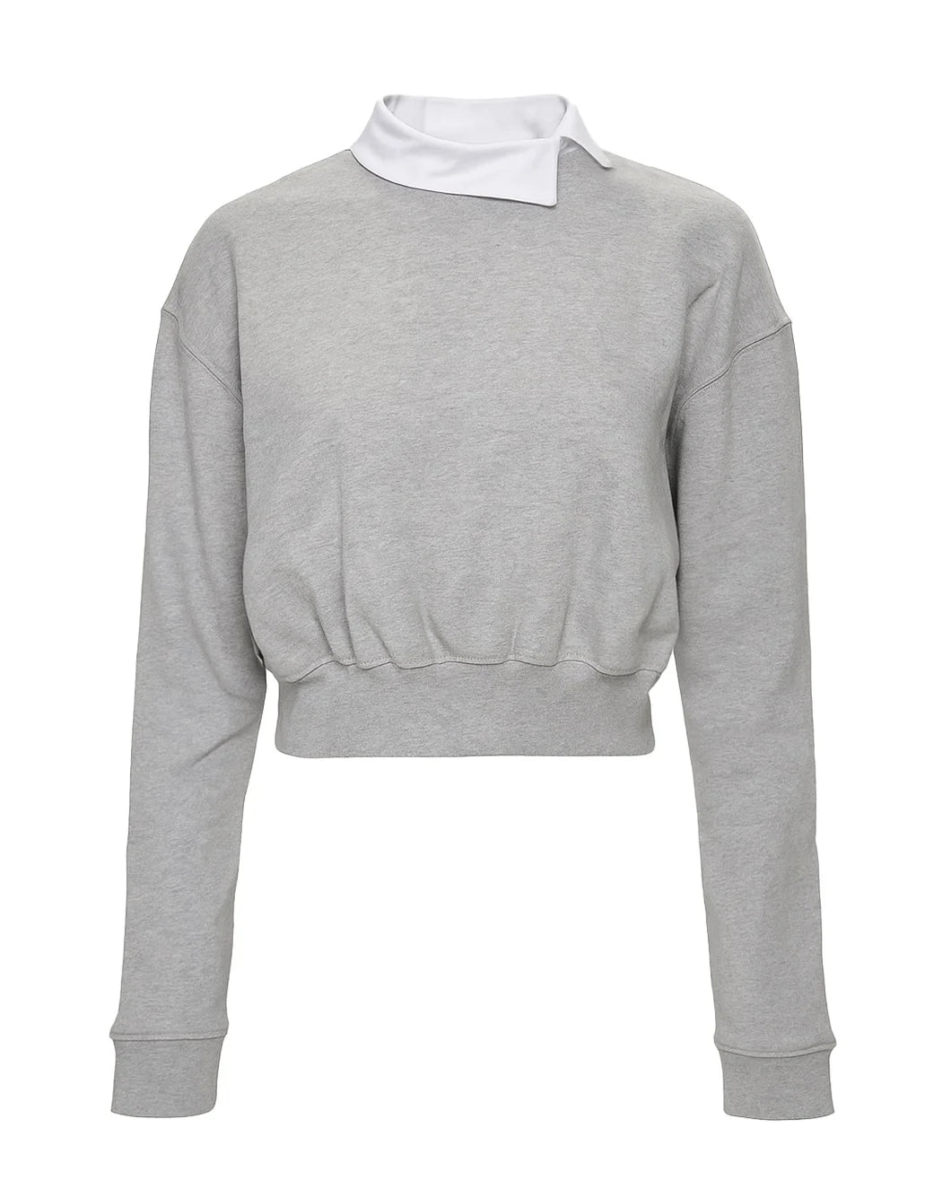 The Rugby Shirt in Grey by A.W.A.K.E. Mode is a cropped, long sleeve shirt featuring an asymmetrical collar neckline with concealed button placket. Perfect for layering in transitional months. Slightly cropped, relaxed fit #AW25.JT03.OC02.Grey
