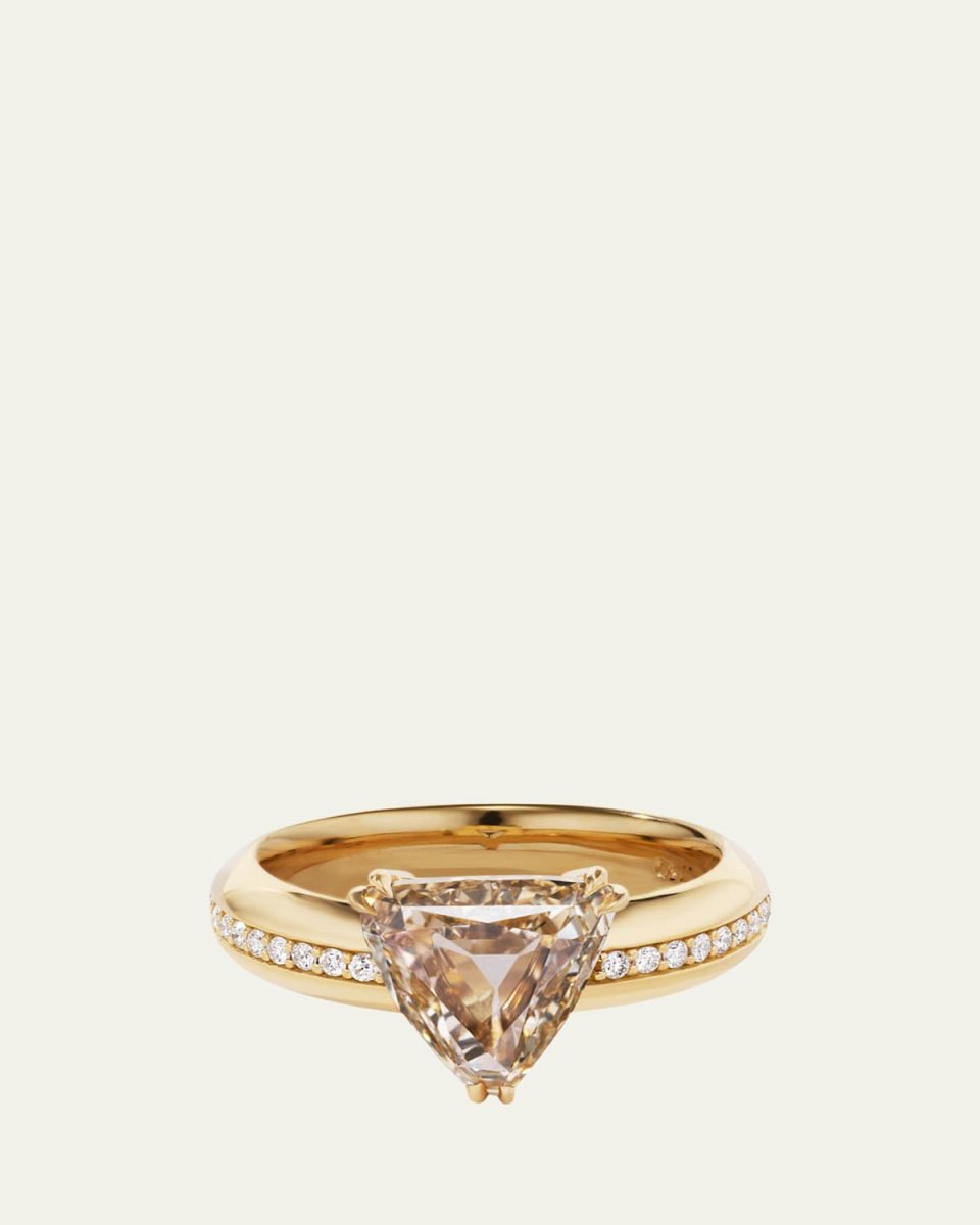 Aaryah ring Approx. ring size 7; 3.7mm 5mm band 18karat yellow gold with a polished finish Trianglecut YZ/VS2 light brown center diamond Triangle diamond dimensions: 9.79mm x 9.77mm x 3.53 mm Round brilliantcut GH/VS1VS2 accent diamonds Total diamond carat weight: 2.63 This ring is GIAcertified Made in USA