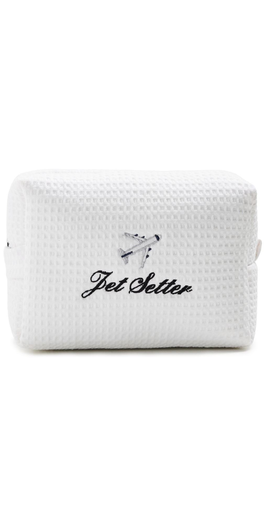 Waffle knit. Padded design. Embroidered plane motif and 'Jet Setter' lettering at front. Zip at top. Lining: Technical weave. Weight: 4oz / 0.11kg. Imported, Pakistan. Measurements: Height: 6.25in / 16cm Length: 8.25in / 21cm Depth: 3.5in / 9cm