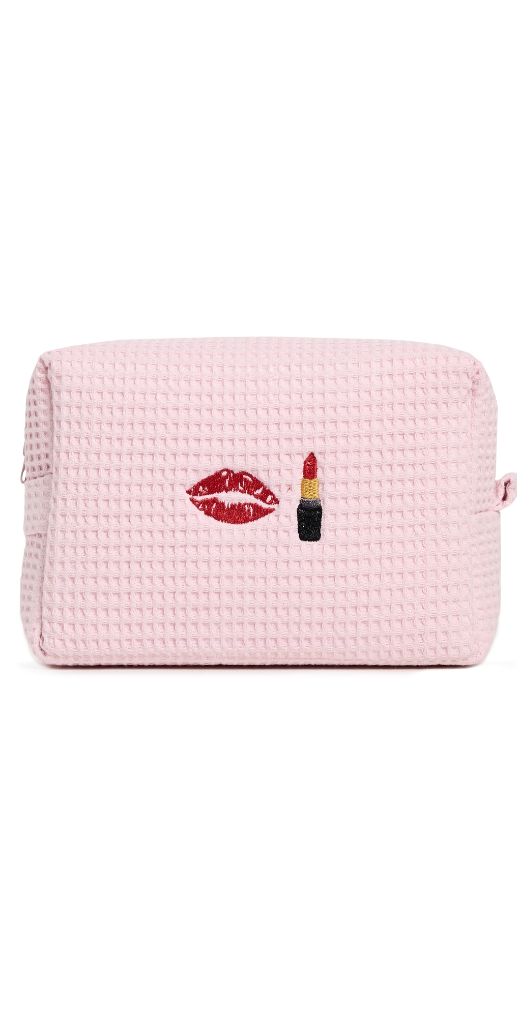 Waffle knit. Padded design. Embroidered lip and lipstick motifs at front. Zip at top. Lining: Technical weave. Weight: 4oz / 0.11kg. Imported, Pakistan. Measurements: Height: 6.25in / 16cm Length: 8.25in / 21cm Depth: 3.5in / 9cm