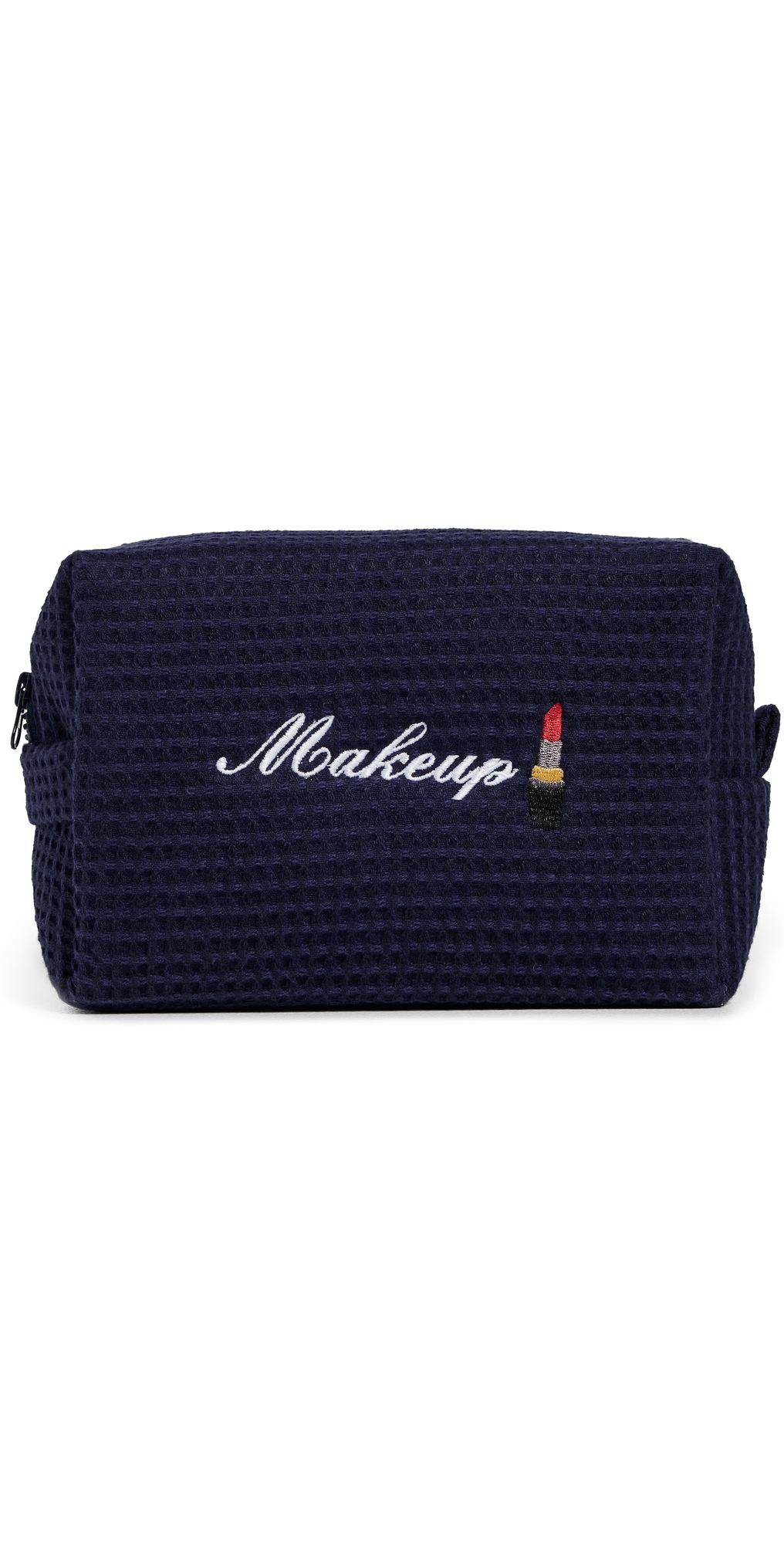 Waffle knit. Padded design. Embroidered lipstick motif and 'Makeup' lettering at front. Zip at top. Lining: Technical weave. Weight: 4oz / 0.11kg. Imported, Pakistan. Measurements: Height: 6.25in / 16cm Length: 8.25in / 21cm Depth: 3.5in / 9cm