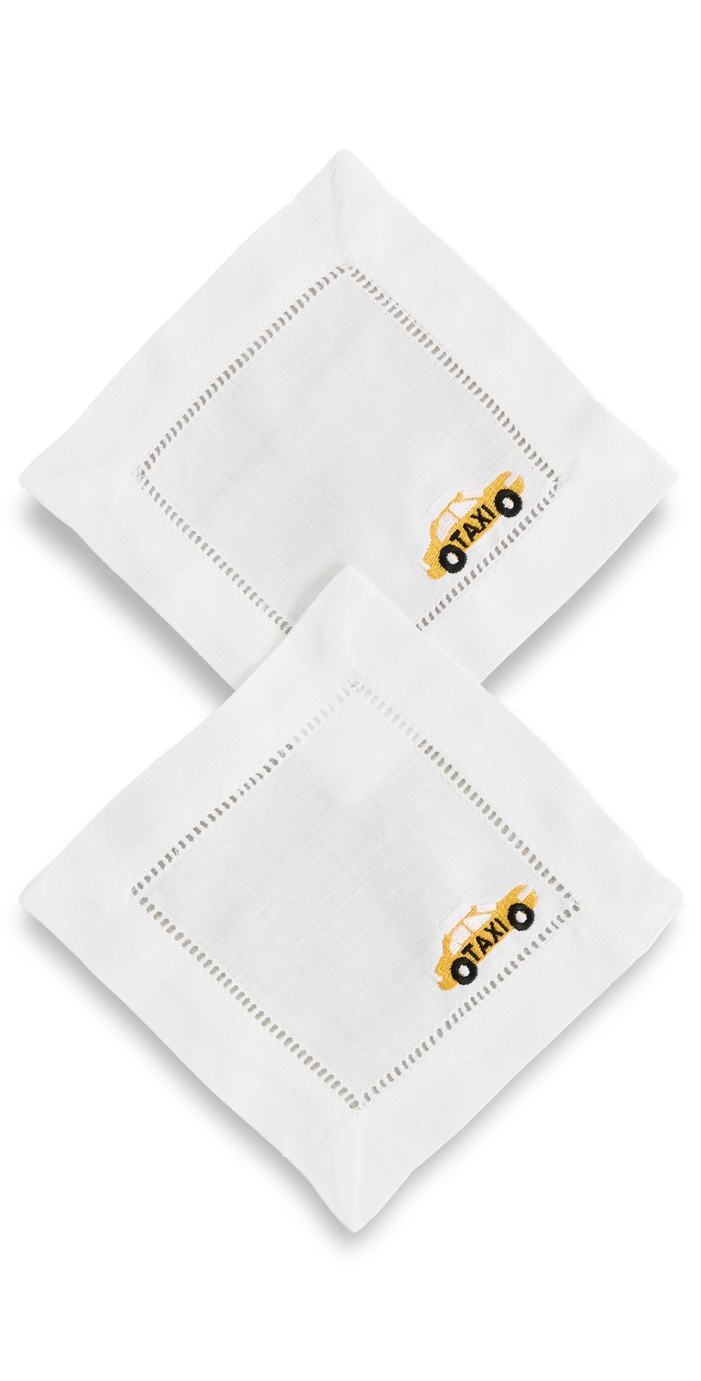 Embroidered taxi motif. Ladder stitch trim. Set of 2. Imported, China. Measurements: Width: 6in / 15cm Length: 6in / 15cm