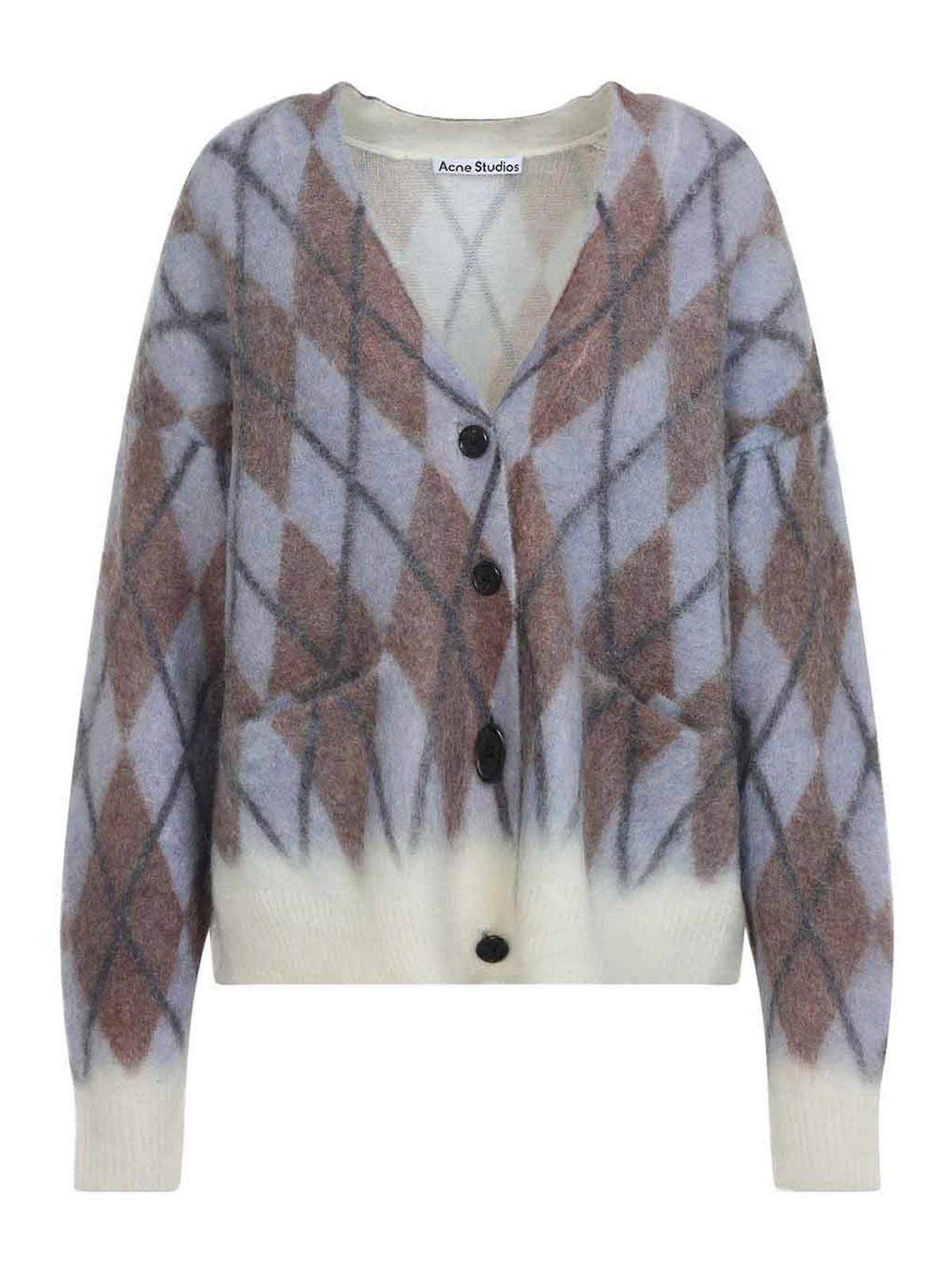 Cardigan gris et marron Acne Studios confectionné en gris et marron brossé et motif à losanges mélangés sur l'ensemble du col, col boutonné, deux poches sur les épaules tombantes, manches longues, bords côtelés, coupe décontractée