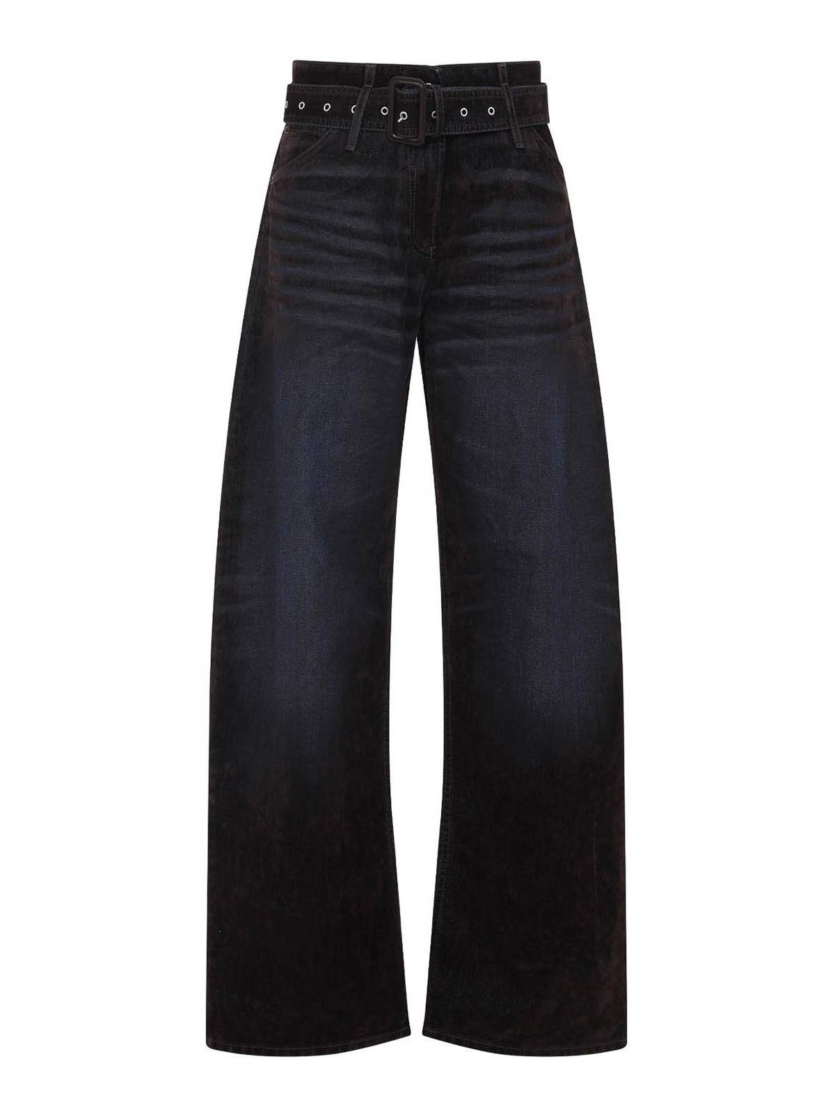 Jean bleu Acne Studios confectionné en jean bleu foncé, taille basse, passants de ceinture, ceinture amovible avec boucle et aillets, poche, boutons et braguette, fermeture éclair, jambes larges, coupe décontractée