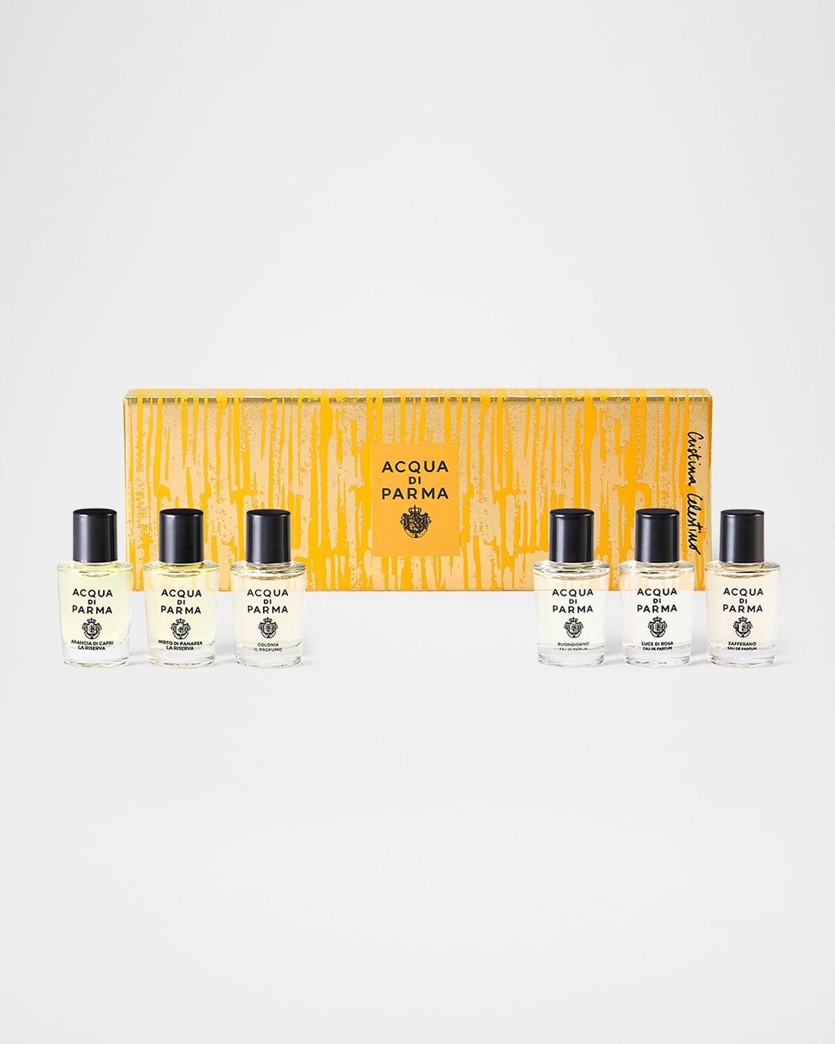 This Miniature Set, presented in a special box adorned with Cristina Celestino's bold graphic reinterpretation of traditional craftsmanship, is a curated discovery of Acqua di Parma fragrances. Cristina Celestino's signature adorns the coffret, enhancing this collector's set with a unique design gesture. Featuring six iconic fragrances in 5mL formats: Colonia Il Profumo: A contemporary reinterpretation of our cherished fragrance heritage, presented in a sophisticated Eau de Parfum that exalts the vibrant, golden character of our signature citrus fruits through a refined blend of ylang ylang and patchouli. Mirto di Panarea La Riserva: An homage to the wild myrtle fruit and rugged landscape of Panarea's volcanic fields, Mirto di Panarea La Riserva is crafted from a twomonth maceration process, infusing it with depth and texture that results in a full, intense, and silky essence. Arancia di Capri La Riserva: An intense and multinuanced fragrance from a twomonth maceration process, evoking the succulent sensation of a freshly handpeeled ripe orange on a breezy morning with hints of wild rosemary. Buongiorno: Inspired by the Tuscan hills in spring, Buongiorno expresses the vitality of new beginnings with a luminous codistillation of basil and petitgrain-a celebration of Italian joy found in everyday beauty. Zafferano: Warm and dry notes of saffron are distilled and combined with luminous notes of Italian golden fruits, like gilded sparks dancing with the intense spicy notes to create an unexpected and vibrant sensation. Luce di Rosa: A genderneutral fragrance where the sublimation of the contemporary and dynamic rose counters mineral sharpness with a chiaroscuro effect, giving light to a multifaceted scent 6 x 0.17 oz. / 5mL *Please Note: The ingredient list is subject to change. Please refer to the product packaging for the most uptodate ingredient