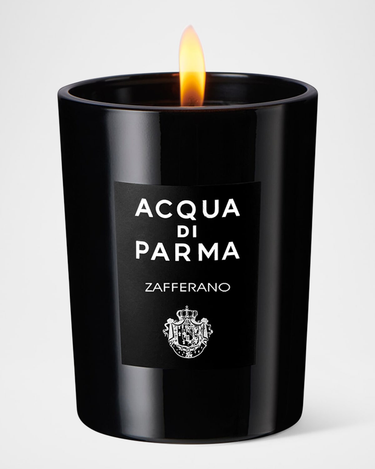 A luxury candle expressing the intense and spicy notes of Zafferano that evokes an unexpected and vibrant touch across your home. Warm and dry notes of saffron meet luminous notes of Italian golden fruits in this Zafferano candle that embodies Signatures of The Sun's art of perfume. Crafted from white wax and set in a shiny black lacquered glass jar, the candle sets an atmosphere of elegance and modernity. The 200g candle comes in a foldable outer pack made from yellow FSC paper. Top Notes: Mandarin Accord, Bergamot Accord Heart Notes: Jasmine Accord, Rose Accord Bottom Notes: Tonka Accord, Vanilla Accord, Patchouli Indonesia Essence Burn Time: 50 hours 7 oz. / 200g IMPORTANT - PRECAUTIONS FOR USE: To ensure the best experience from your scented candle, Acqua di Parma recommends: • Do not burn your candle for more than 1.5 hours at a time. This will prevent the flame from becoming too high, which creates smoke and could stain the sides of the glass. • Use a proper snuffer to extinguish the flame. • Allow the candle to solidify before relighting it. • Restraighten the wick in the wax after each use for consistent wax consumption. • Regularly cut the wick with a wick trimmer (ideal length 5 mm) so that the wick does not stick to the wax and prevent the candle from emitting smoke. • Keep the wax pool clear of matches and debris. • Do not use the candle if the remaining wax level in the glass is less than 5mm. • Do not leave the burning candle unattended. Keep away from children, curtains, and pets. • Do not move a burning candle or when the wax is still hot. Wait for the wax to solidify. • Do not place the candle on heatsensitive surfaces, near flammable materials, an open window, or other candles. • If medical advice is needed, have the product container or label at hand. Keep out of reach of