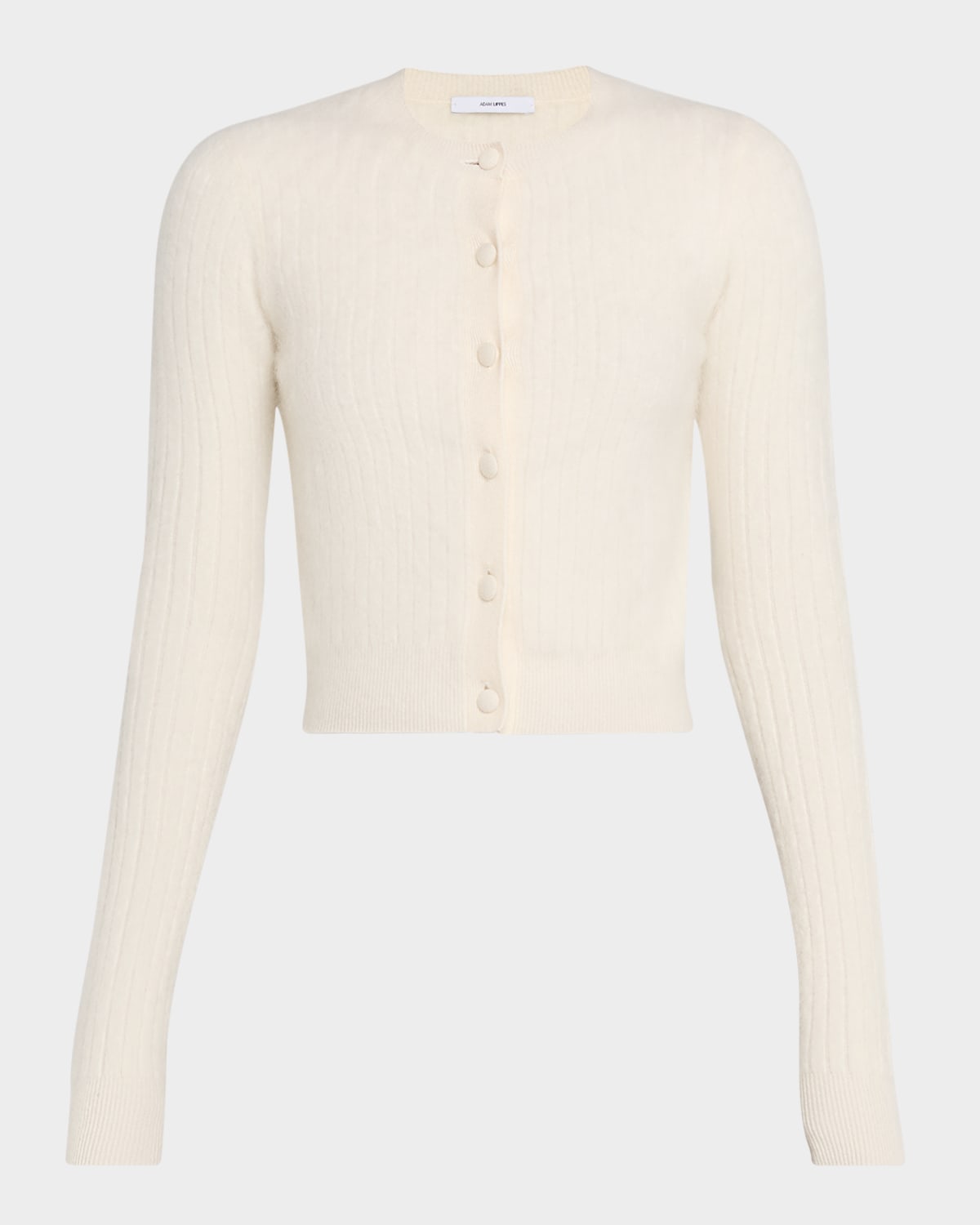 Adam Lippes "Cruz" cardigan in wide ribbed knit Crew neckline; button front Long sleeves Fitted Cropped length Ribbed cuffs and hem Cashmere Imported