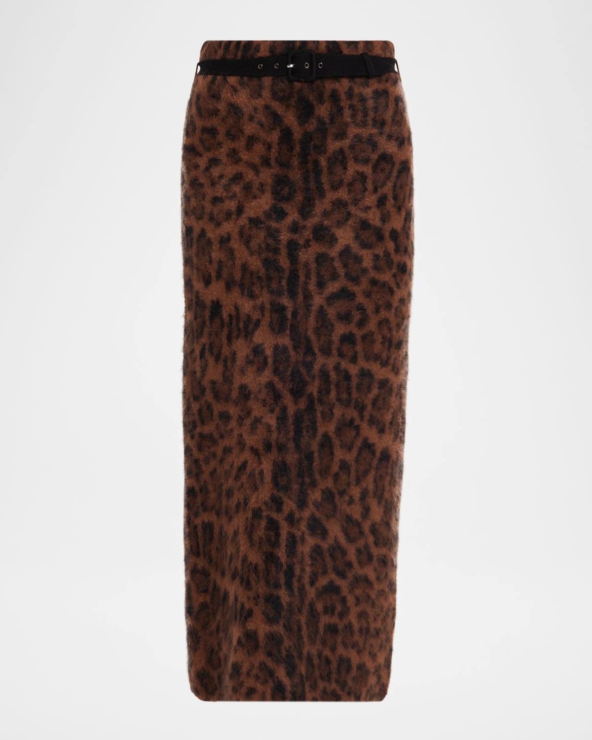 Adam Lippes "Levi" luxurious cashmere skirt featuring a leopard print and a contrast belt High waist Hem falls below the knee Skirt falls straight from hip to hem Back slit Pullon style Cashmere Dry clean Imported