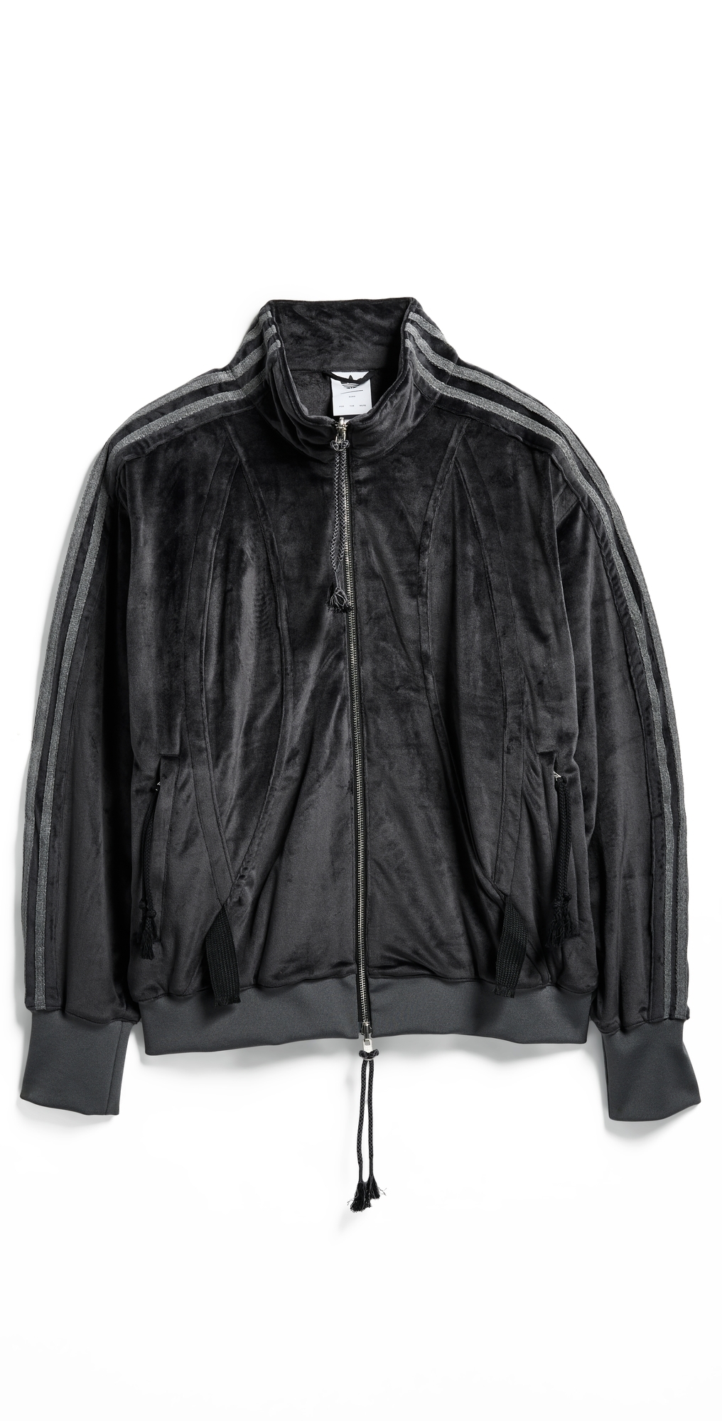 Cannot be shipped outside the USA Fabric: Mid-weight stretch velour. Primegreen fabric contains no virgin plastics and uses a minimum of 40% recycled content. Applique lettering at back. Terry stripes at shoulders and sleeves. Webbing straps at front. Ribbed elastic trim. Mock neck. Long sleeves with dropped shoulders. Two-way zip closure. Zip front pockets. Shell: 93% polyester/7% spandex. Unlined. Wash cold. Imported, China. Measurements: Measurements from size XS Length: 24.5in / 62cm Sleeve: 33.5in / 85cm Chest: 50in / 127cm
