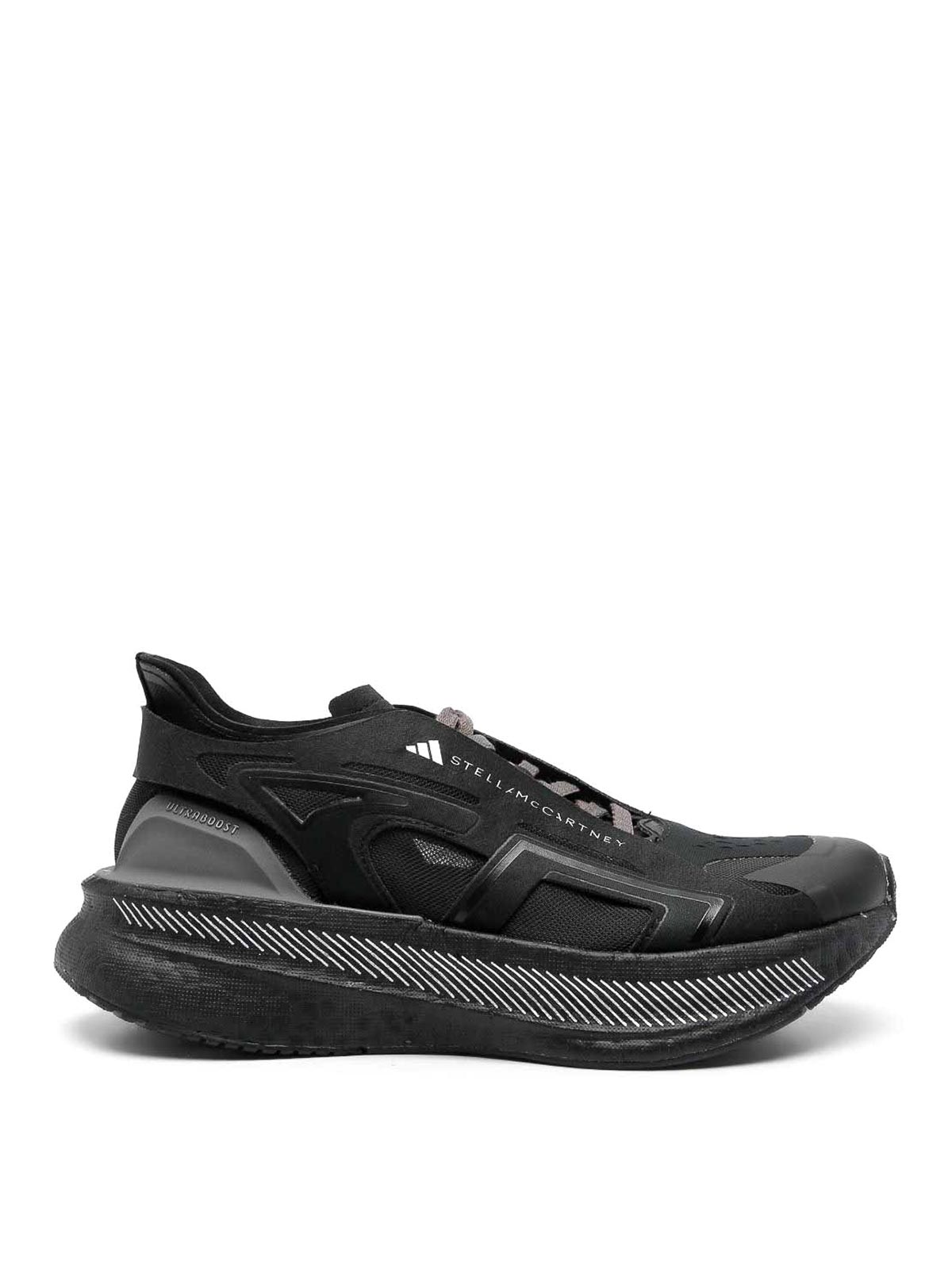 Design en maille noire, design à panneaux, lacets, bretelles, logo imprimé sur le côté, logo imprimé sur le côté, languette imprimée, détails perforés, bout rond, marque de la marque emblématique, boutonnage rembourré au milieu de l'extérieur