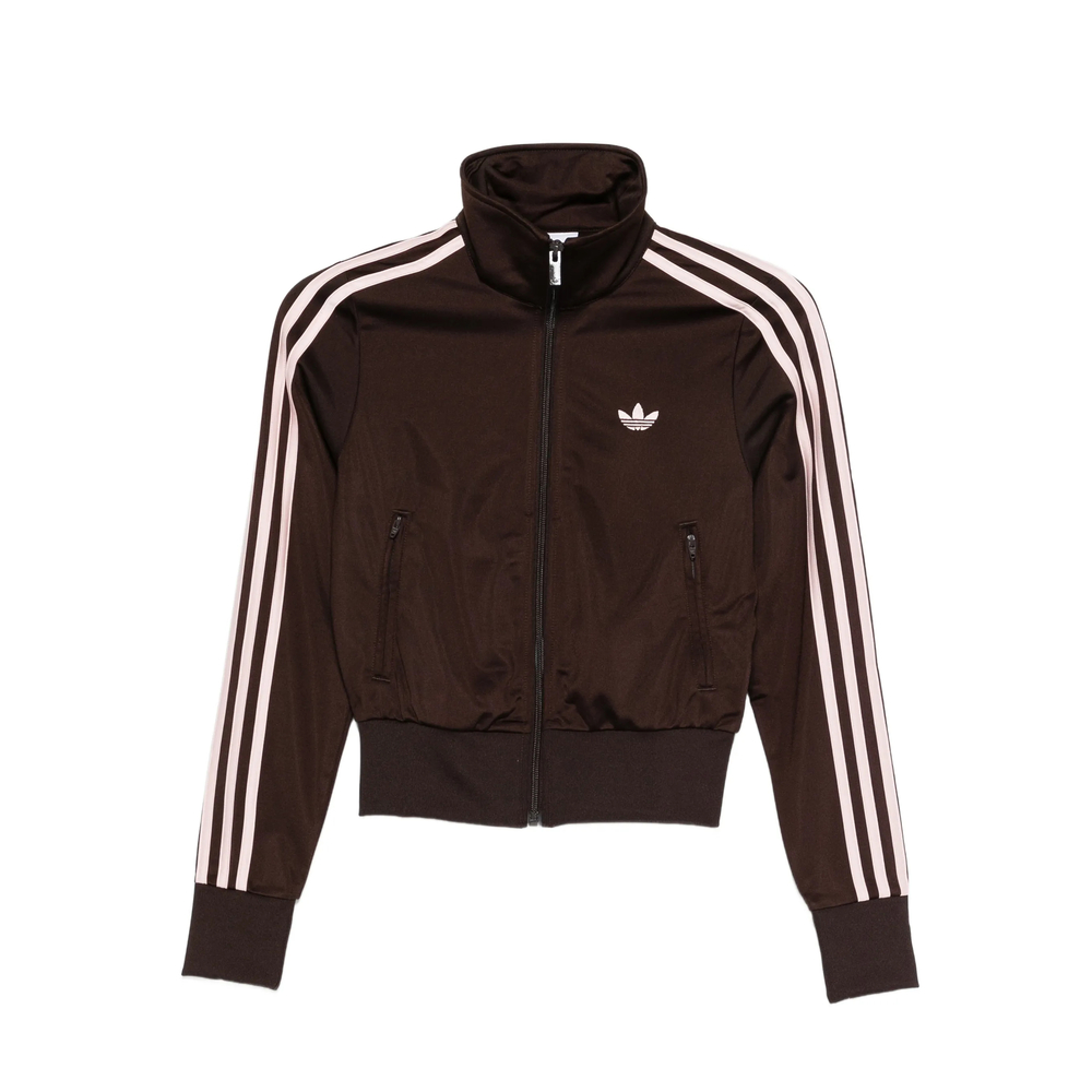 dark brown and pink three stripes sleeves zip fastening front zip pockets logo detail ribbed cuffs