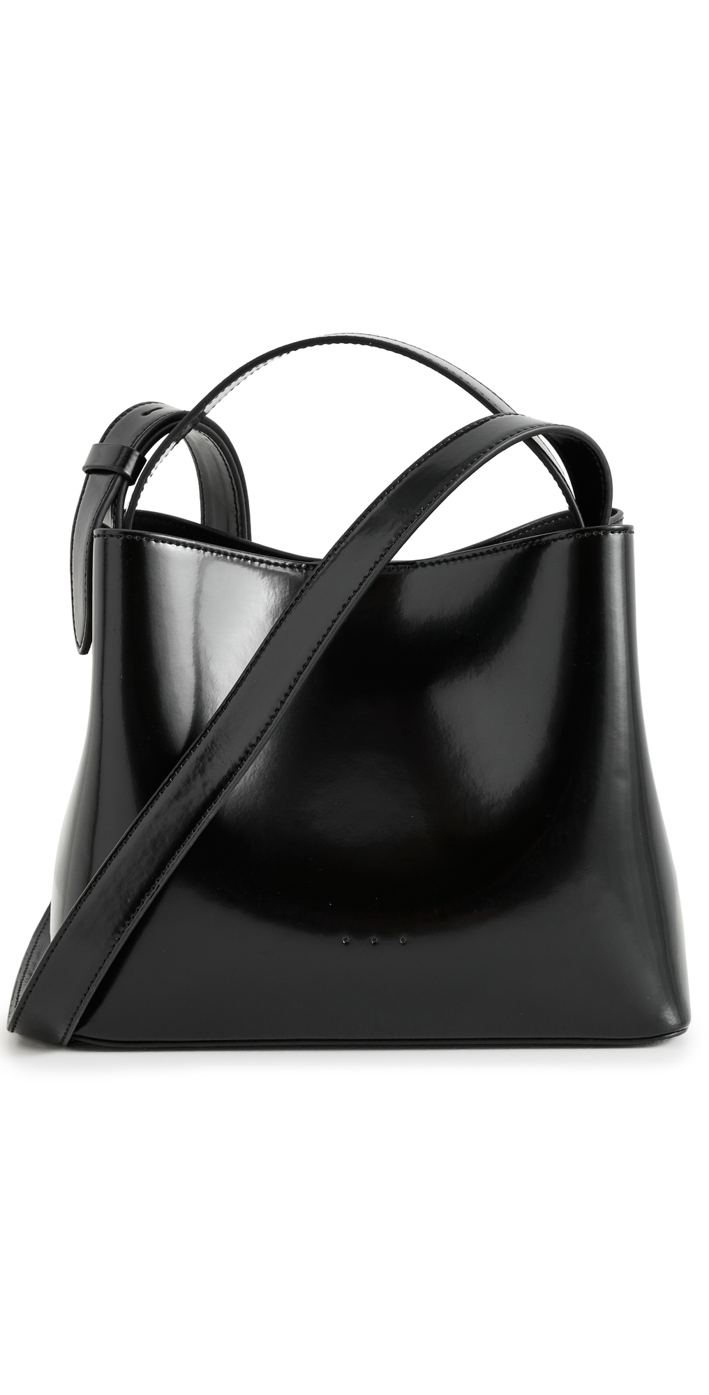 Calfskin. Divided interior. Patent finish. Open top with magnetic closure. Adjustable strap. Lining: Microfiber. Weight: 21oz / 0.6kg. Made in Spain. Measurements: Height: 7.75in / 20cm Length: 9.5in / 24cm Depth: 4.25in / 11cm Strap drop: 19.25in / 49cm Handle drop: 3.25in / 8cm