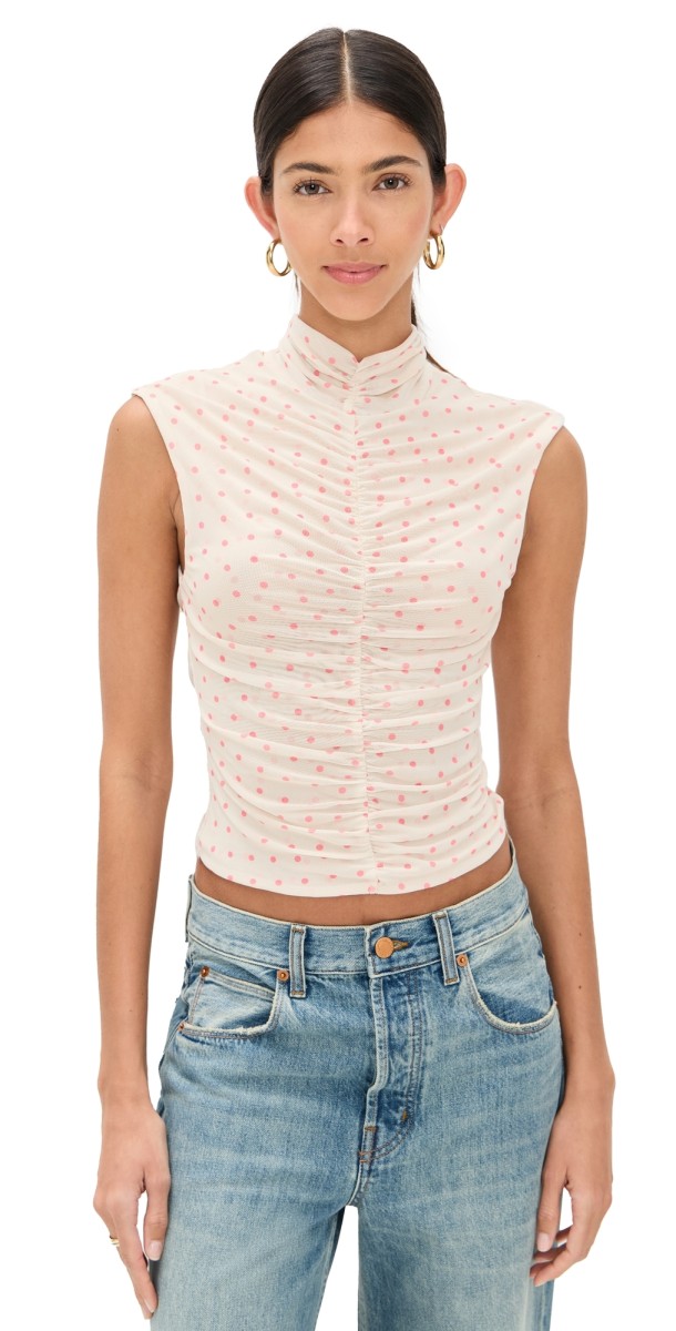 Fabric: Lightweight stretch mesh. Polka-dot print. Ruched front and back seams. Mock neck. Sleeveless. Shell: 95% polyester/5% spandex. Double-layered. Wash cold. Imported, China. Measurements: Measurements from size XS Length: 19in / 48.0cm, from shoulder