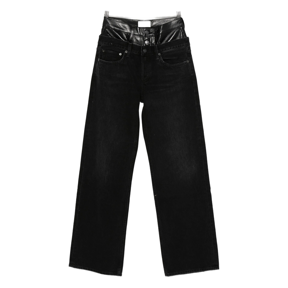 black high-waisted straight leg five pockets belt loops button and zip fastening