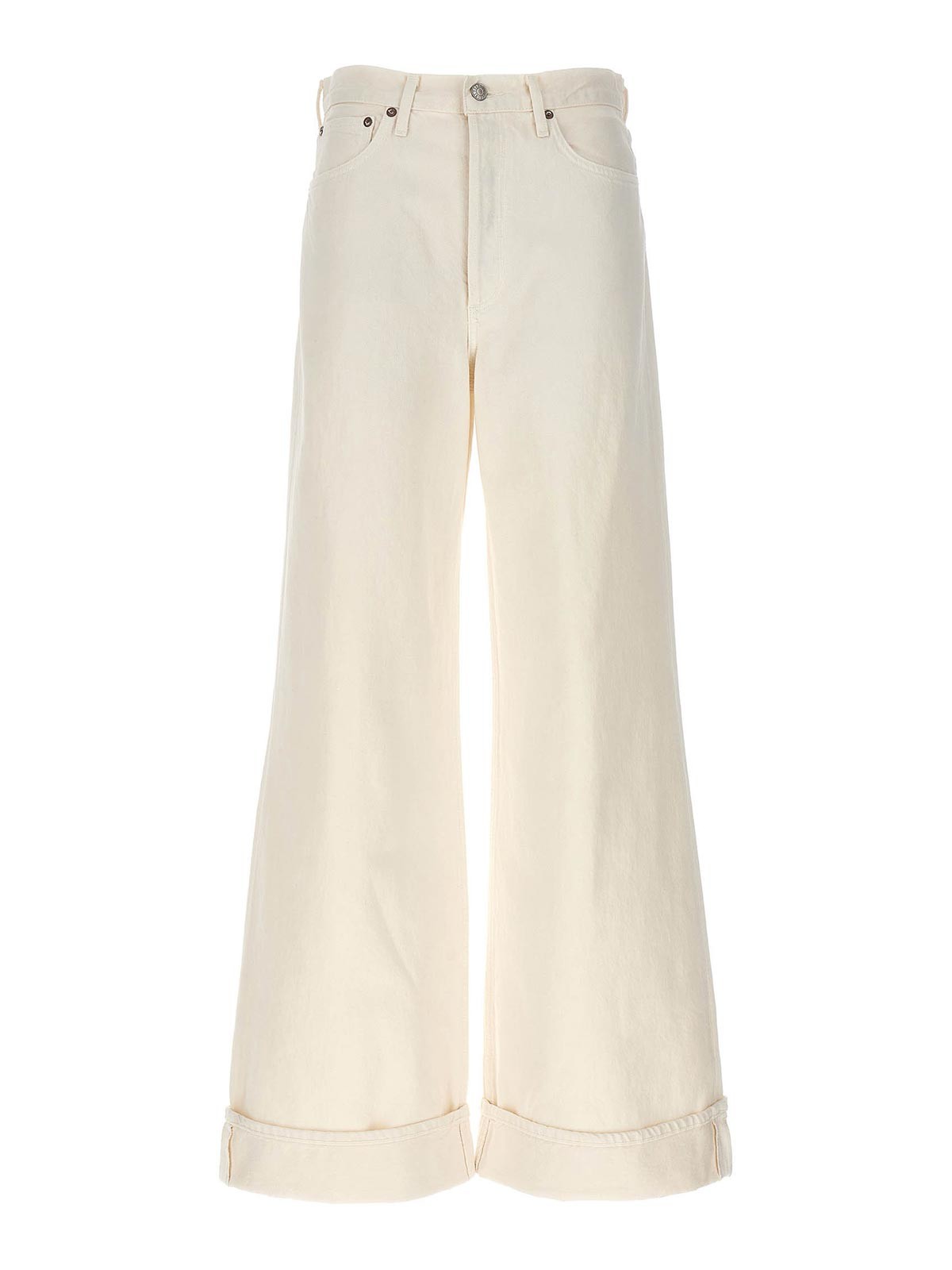 jean en jean pour femme avec cinq poches boutonnées, taille haute, jambe large et ourlet retroussé