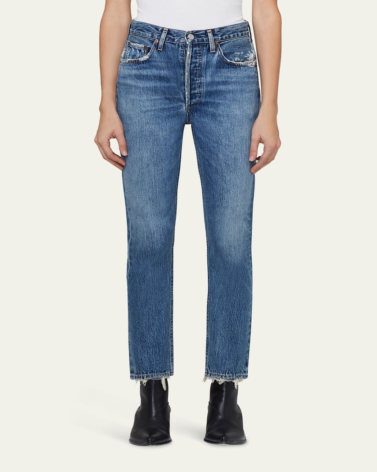 AGOLDE "Riley" jeans in Frequency (medium blue) nonstretch denim. Approx. measurements: 11.5" rise; 29" inseam; 14" leg opening. Highrise; belt loops. Fivepocket style. Fitted through straight legs. Cropped above ankles. Shredded hem. Button fly. Cotton/spandex. Machine wash. Imported.