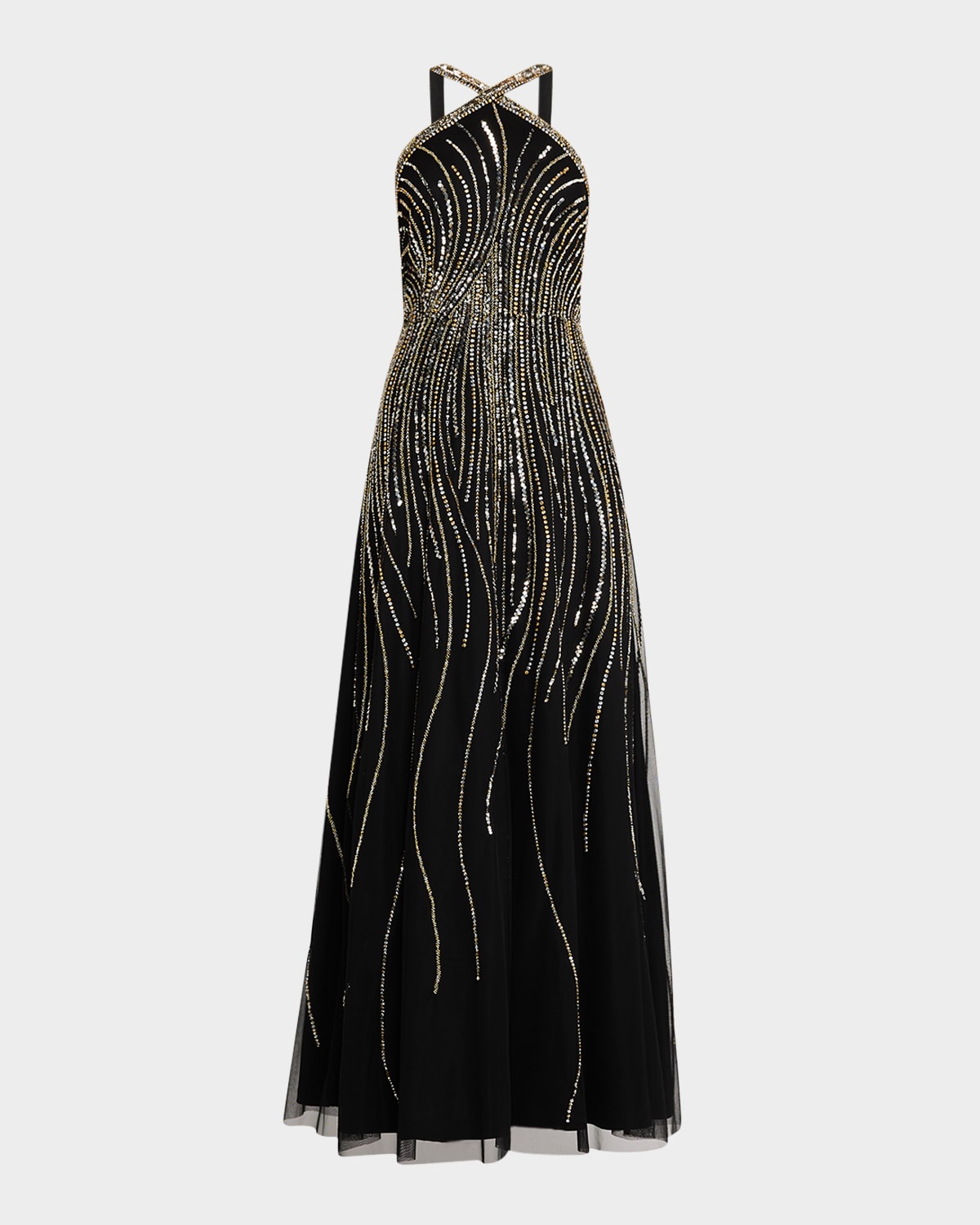 Aidan Mattox gown with sequins, beading, and rhinestones Halter neckline Sleeveless Full length Aline silhouette Invisible back zipper Polyester Lining: Polyester Spot clean Imported