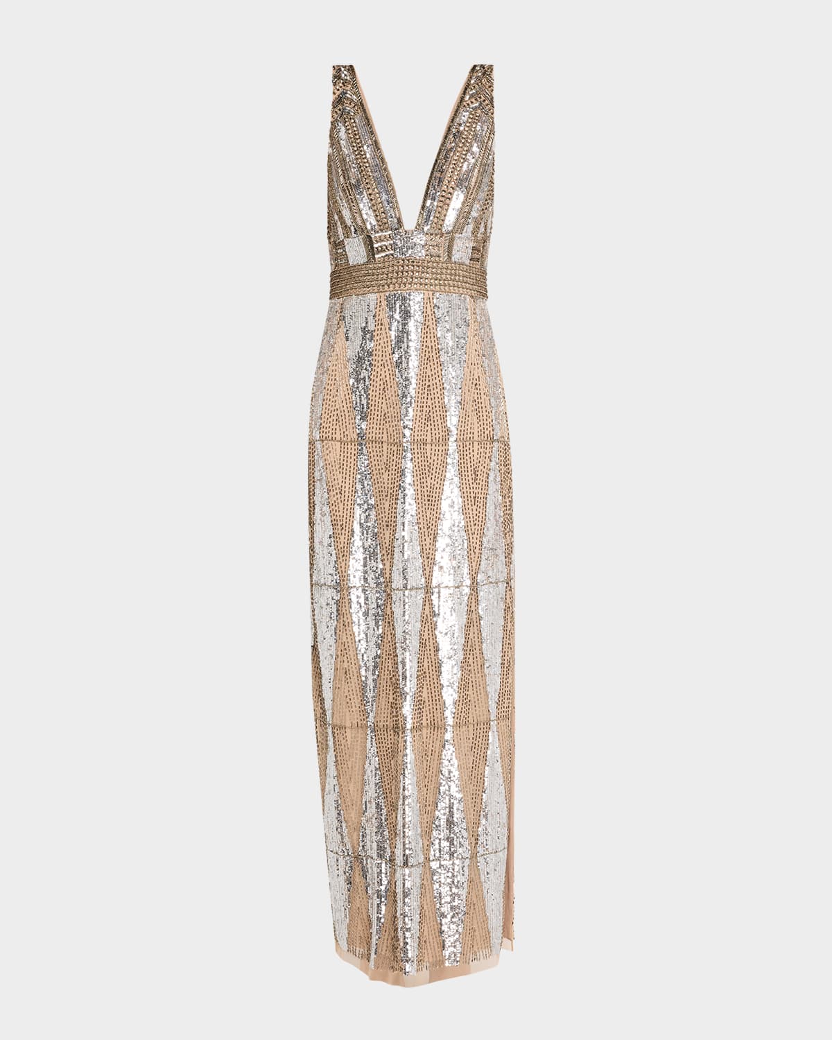 Aidan Mattox gown with beads, sequins, and rhinestones Deep V neckline Sleeveless Kneehigh side slit Full length Column silhouette Back zipper Polyester Lining: Polyester Spot clean Imported