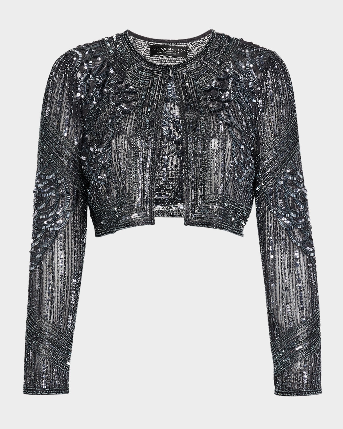 Aidan Mattox jacket with beading and sequins Crew neckline; hook front 3/4 sleeves Cropped style Relaxed fit Polyester Lining: Polyester Spot clean Imported