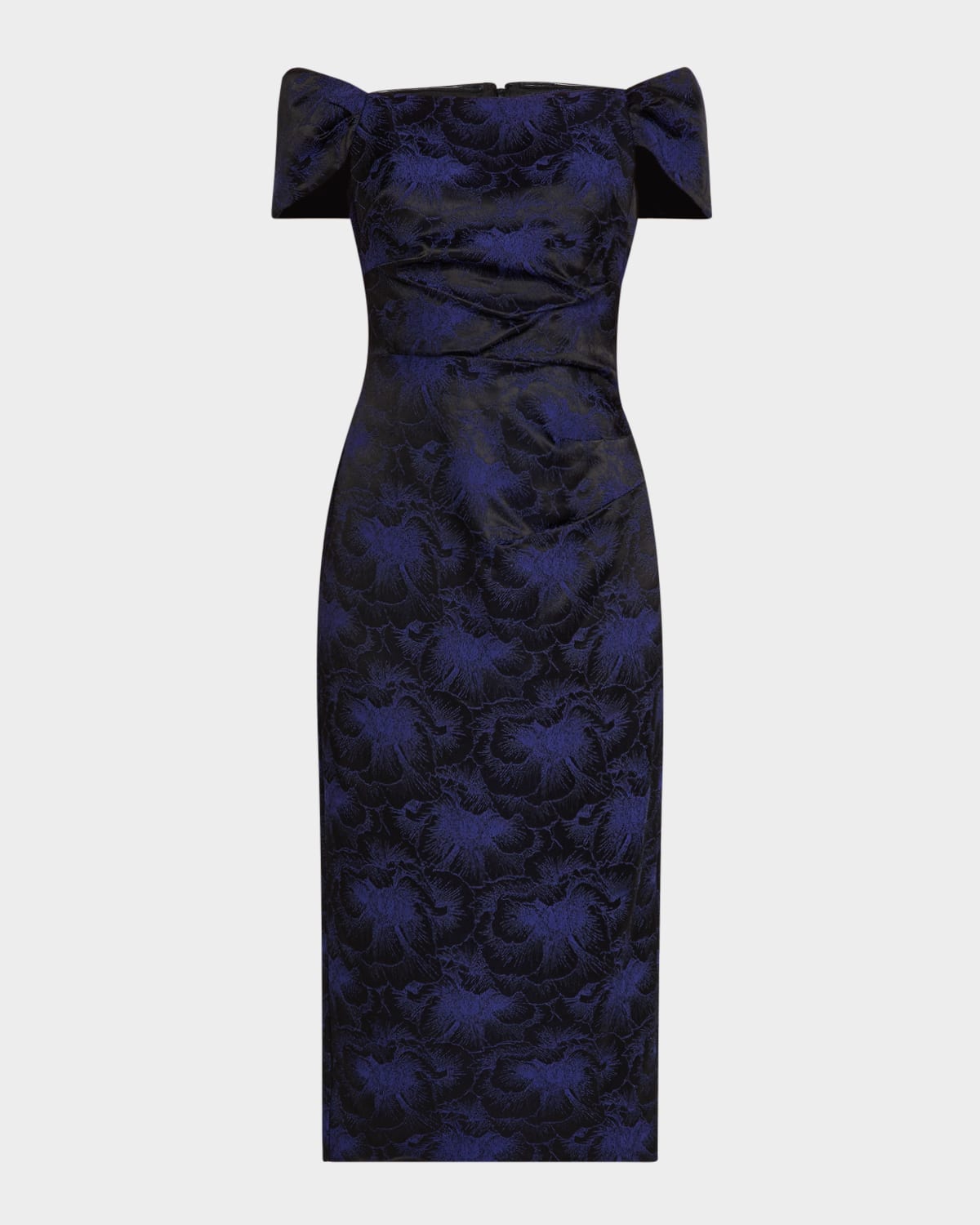 Aidan Mattox midi dress in woven floral jacquard Offtheshoulder neckline Short sleeves Center back slit Hem falls below the knee Bodycon silhouette Invisible back zipper Viscose/polyester Lining: Elastane/polyester Dry clean Imported