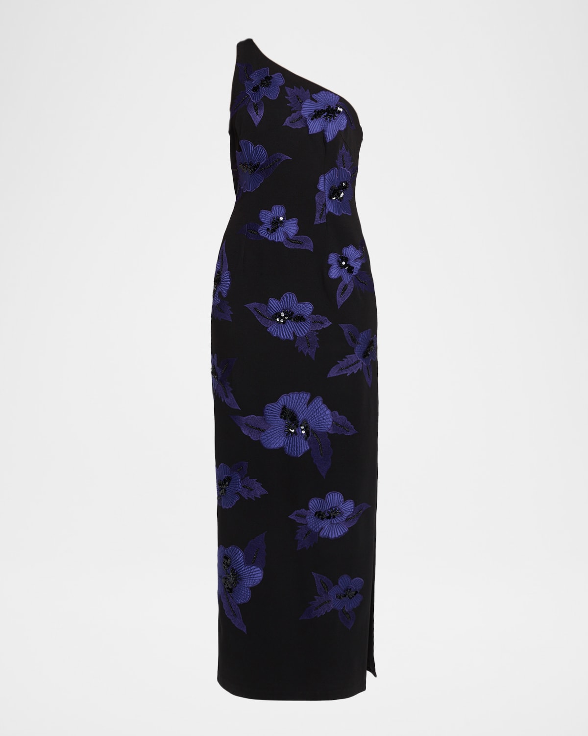 This crepe gown from Aidan Mattox blooms with embroidered floral appliqué, designed in a column silhouette for figureskimming sophistication The floral appliqué glitters with lightcatching beads and sequins Approx. 61"L from shoulders to hem Oneshoulder neckline Sleeveless Side slit hem Full length Column silhouette Zip closure Polyester/elastane Lining: Polyester Spot clean Imported