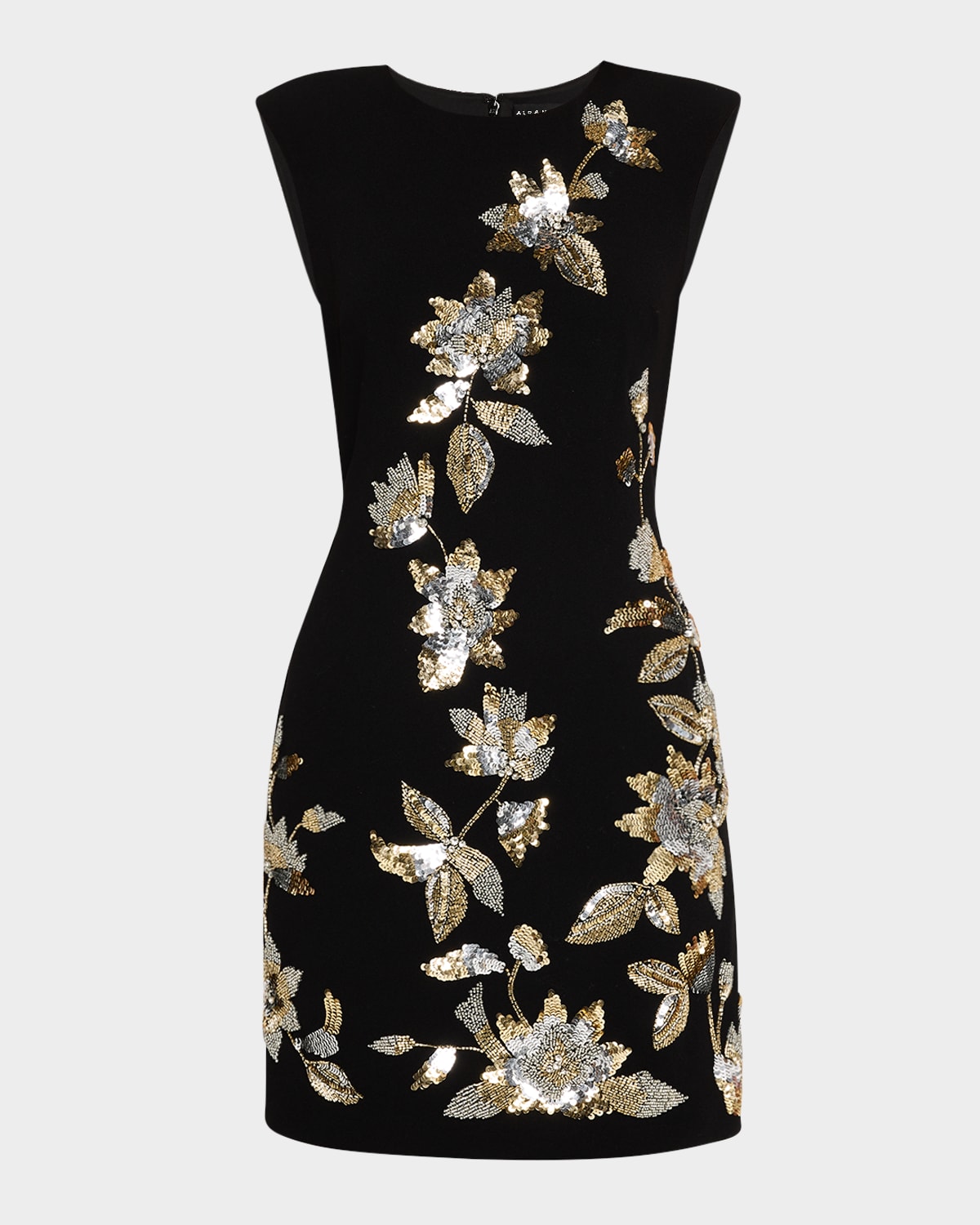 Aidan Mattox mini dress in crepe with sequin florals Jewel neckline Sleeveless Hem falls above the knee Aline silhouette Invisible back zipper Polyester/elastane Lining: Polyester Spot clean Imported