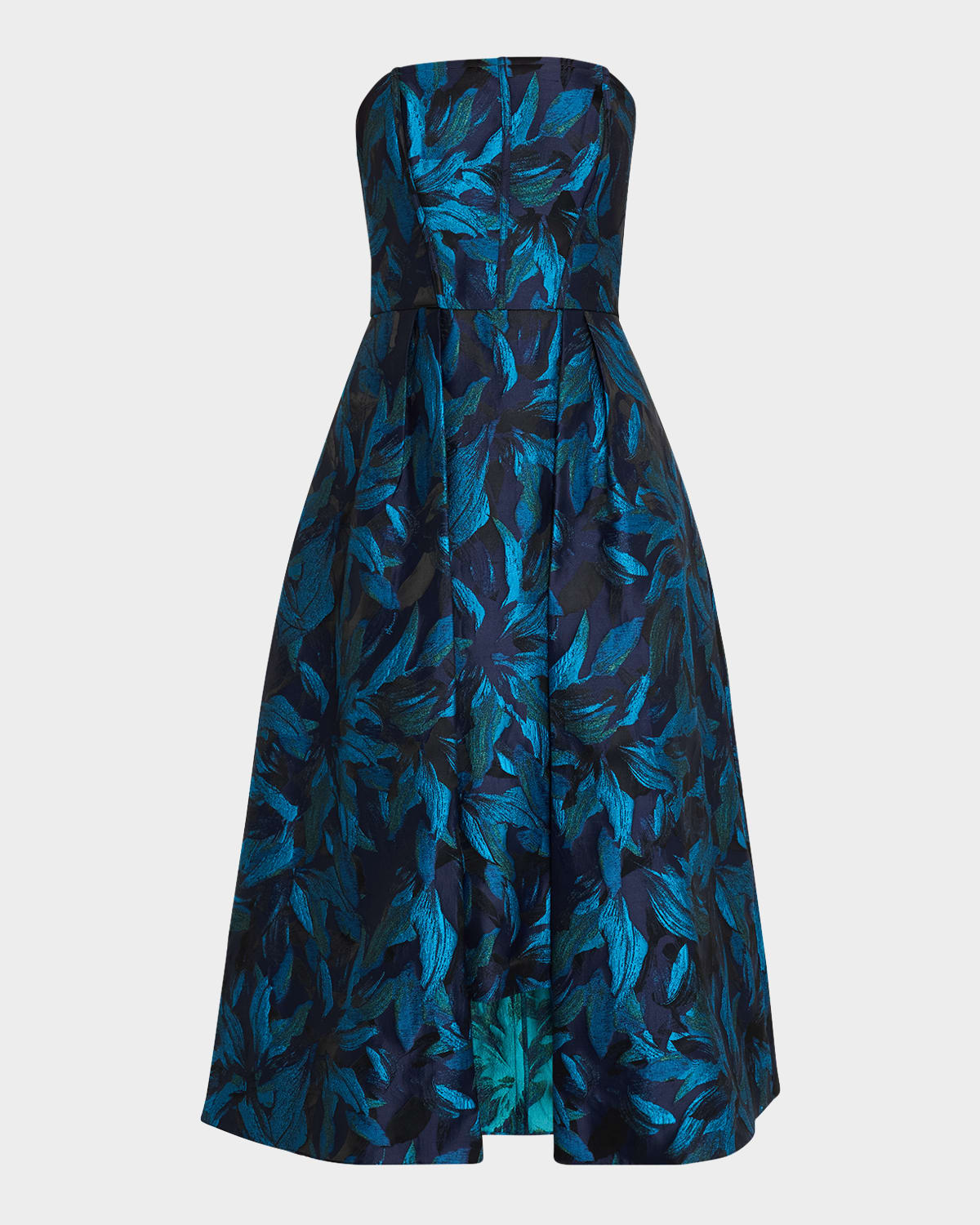 Aidan Mattox midi dress in metallic floral jacquard Strapless neckline Sleeveless Pleated skirt Hem falls below the knee Aline silhouette Invisible back zipper Polyester Lining: Elastane/polyester Dry clean Imported