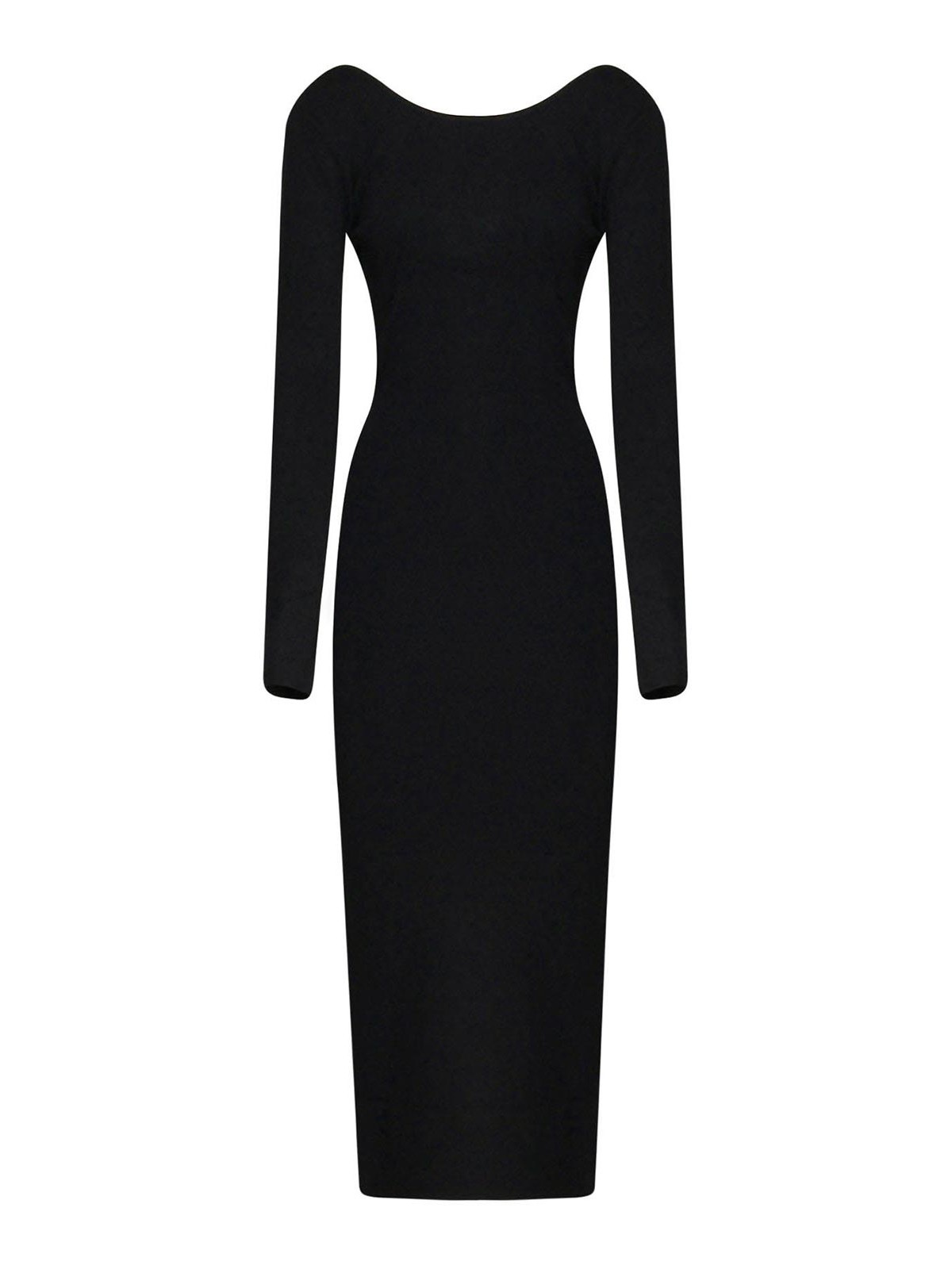 Robe longue, coupe ajustée, manches longues avec fente latérale, encolure profonde dans le dos, couleur noire