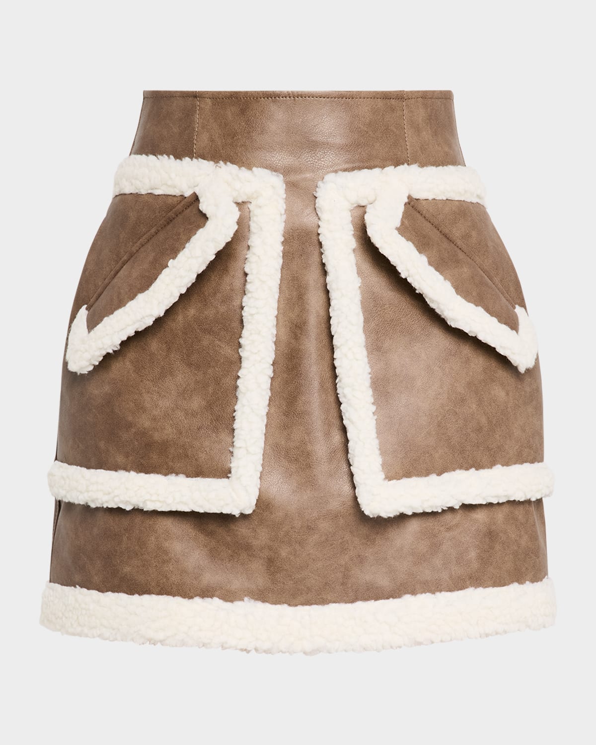 AKNVAS "Cherry" vegan leather mini skirt featuring fauxfur (polyester/cotton) trim High rise Angled flap pockets; side seam pockets Aline silhouette Hem falls above the knee Back zip Polyester/cotton/polyurethane Lining: Polyester Dry clean Imported